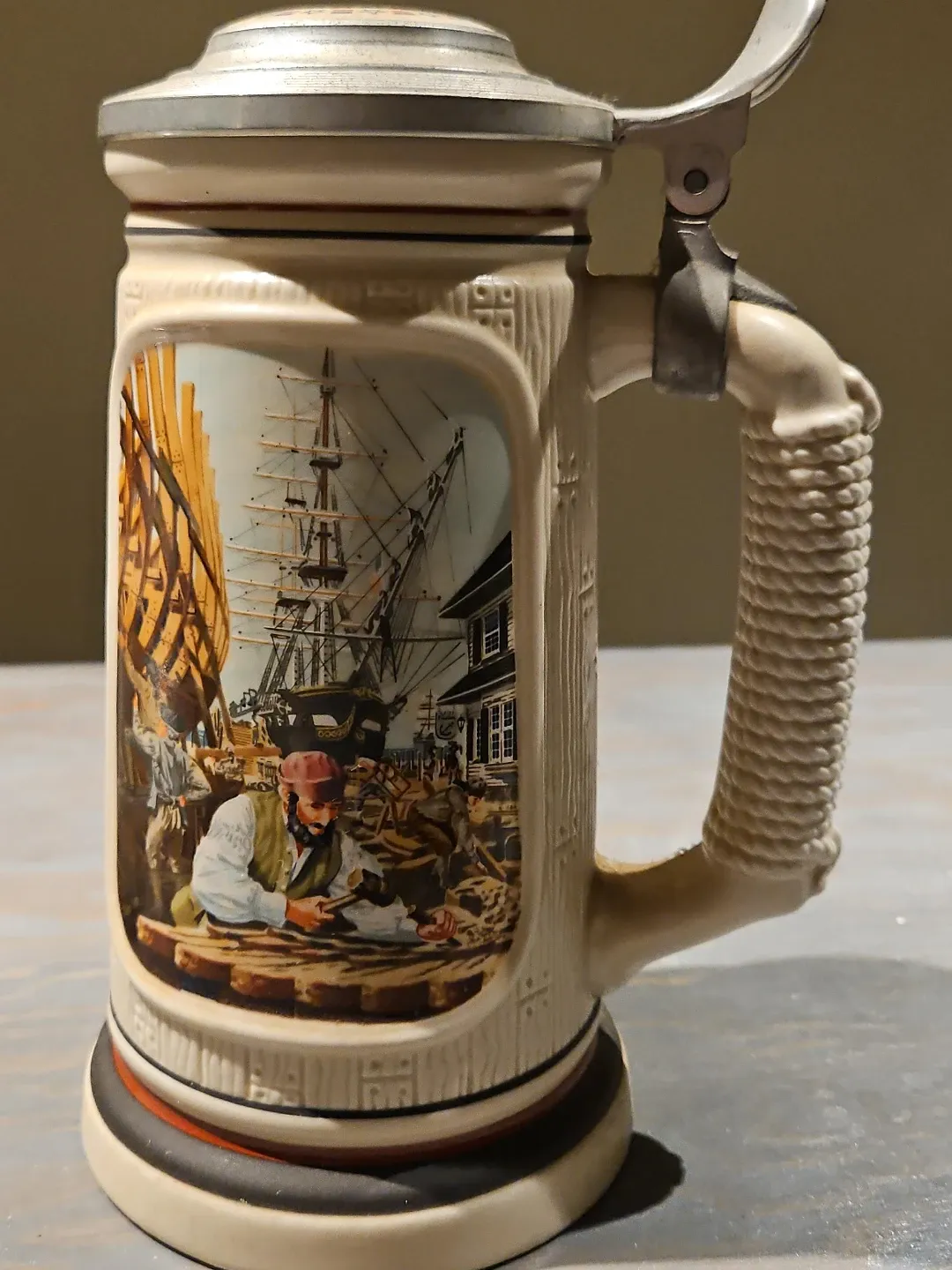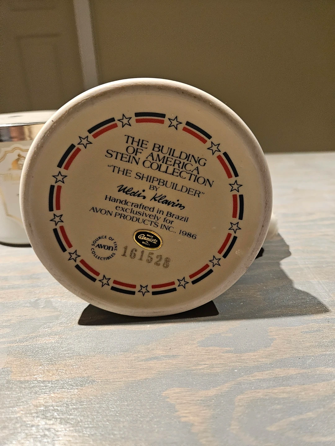 Selling a decorative stein mug from the Avon “The Building of America Stein Collection”. It's titled “The Shipbuilder” by Uldis Klavins and was handcrafted in Brazil exclusively for Avon Products Inc in 1986. Great for collectors or anyone looking for a unique piece!