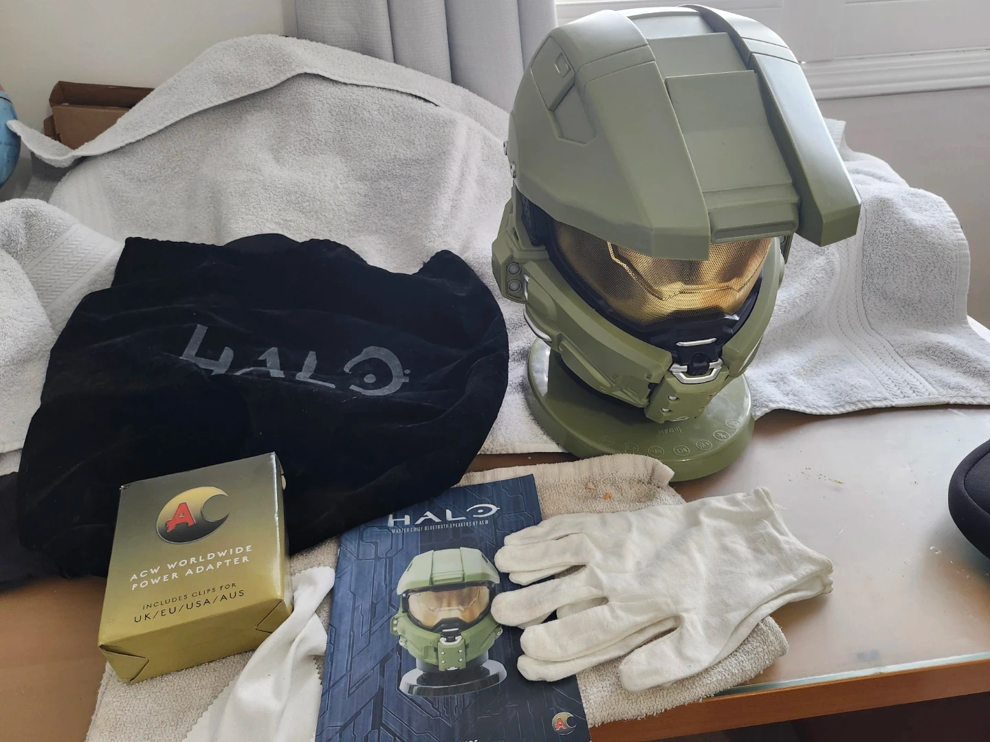 Selling a Halo Master Chief Bluetooth speaker by ACW! It comes with the ACW worldwide power adapter, which includes clips for UK/EU/USA/AUS. Also includes a Halo-branded bag and gloves