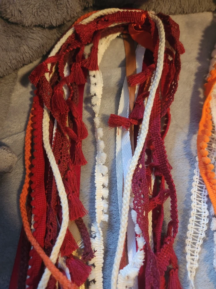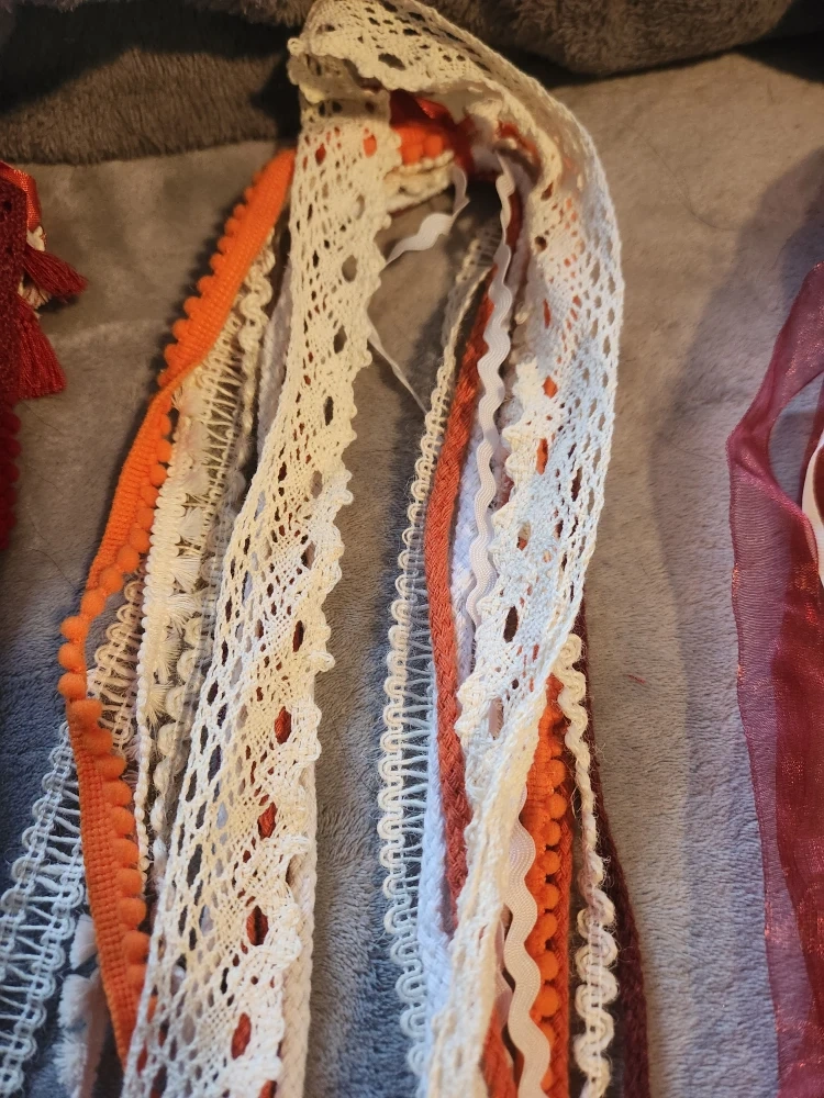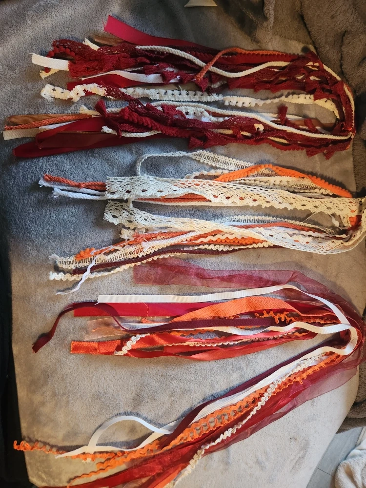 I'm selling a bundle of ribbon scraps in various shades of red, orange, and white. These are perfect for crafting projects, embellishments, or adding a unique touch to your creations! There are different textures and widths in this bundle.