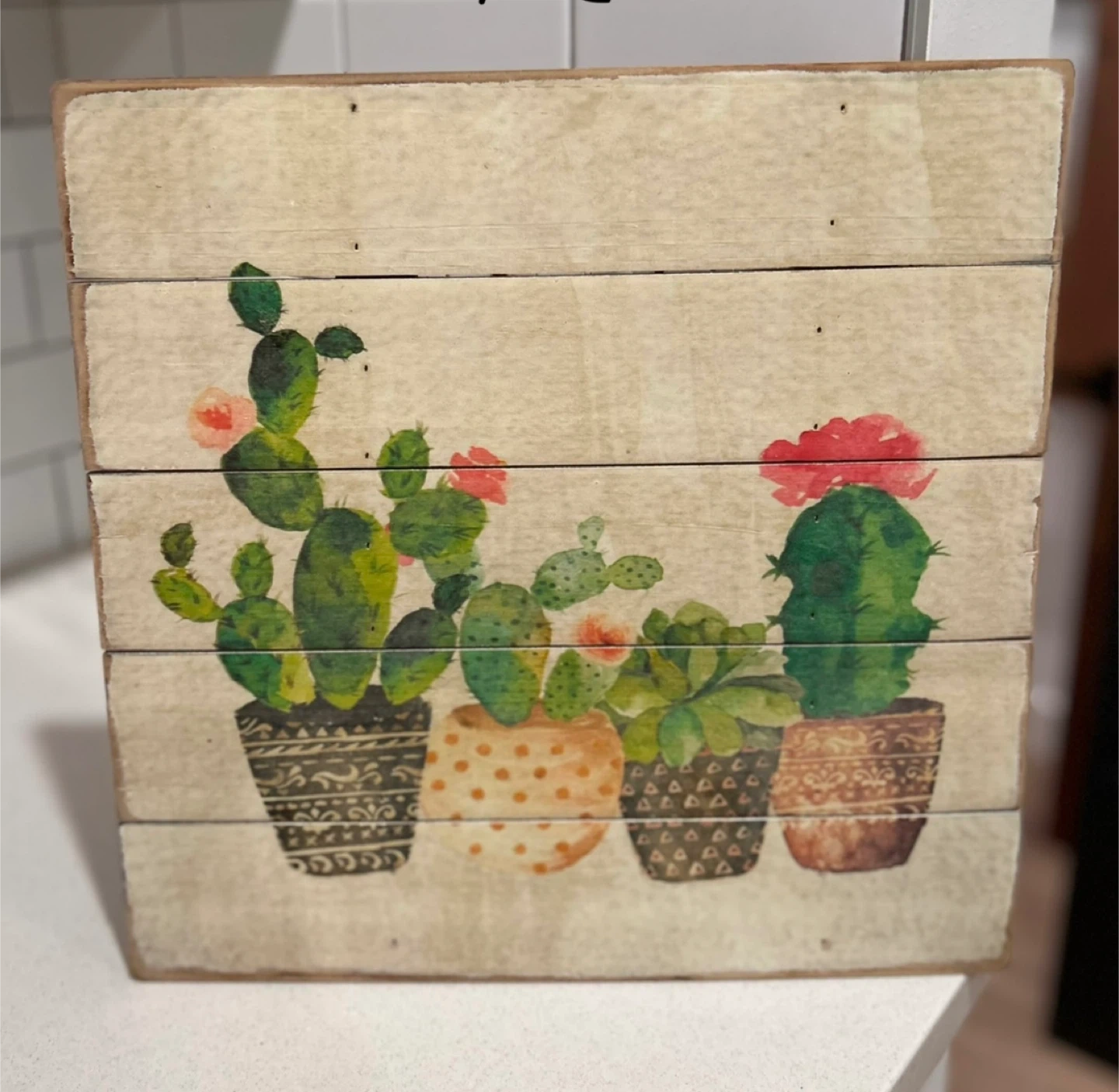 Cute cactus-themed wall art to brighten up any room! Features a charming design printed on wooden planks. Perfect for adding a touch of desert vibes to your home decor