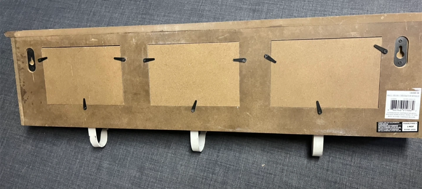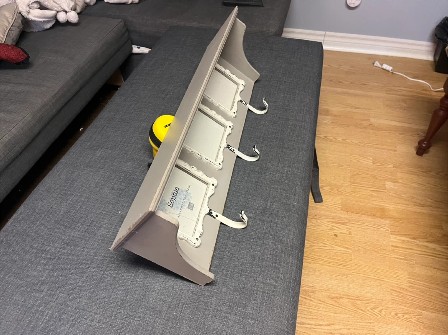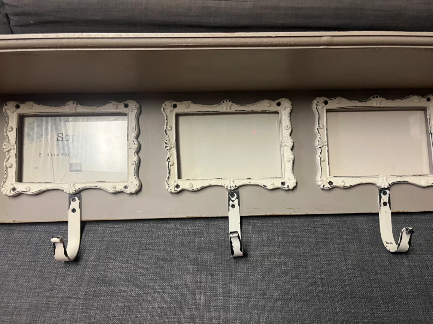 Rustic style shelf with hooks and three photo places with glass to hang and decorate your home. Purchased from Michael’s Canada for $89.99 six years ago and letting for for $50.