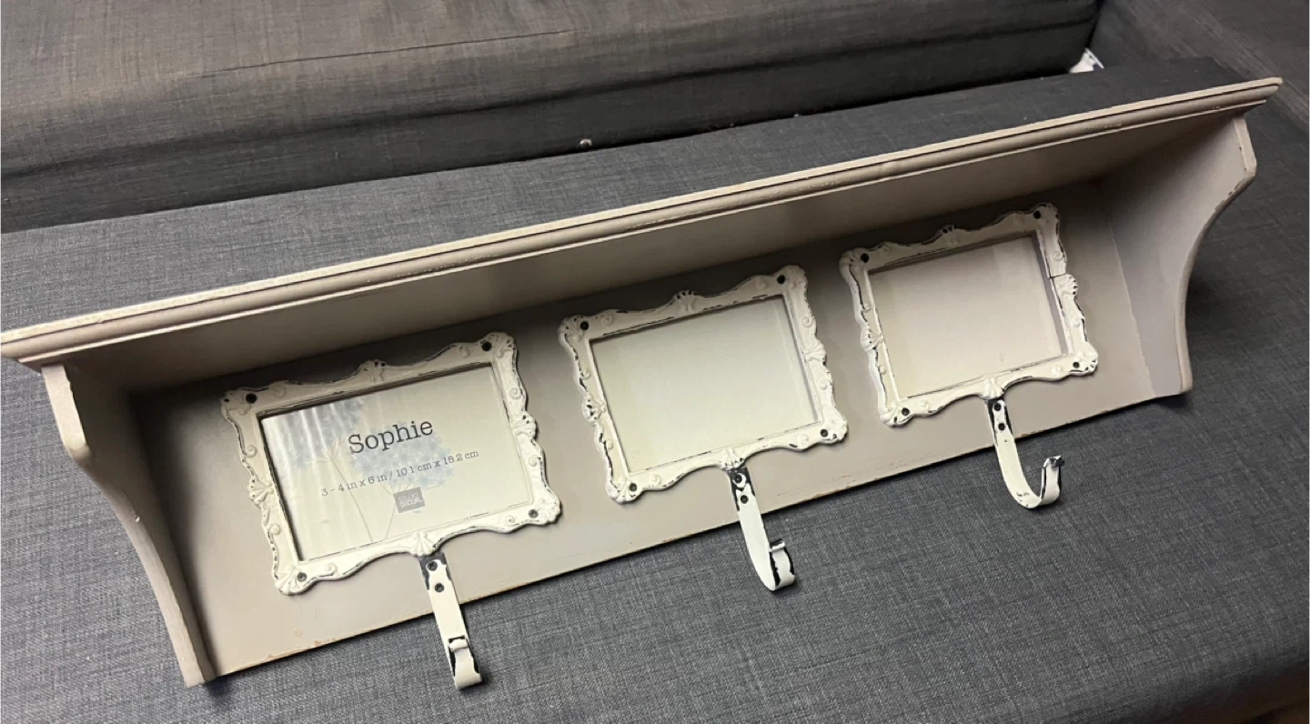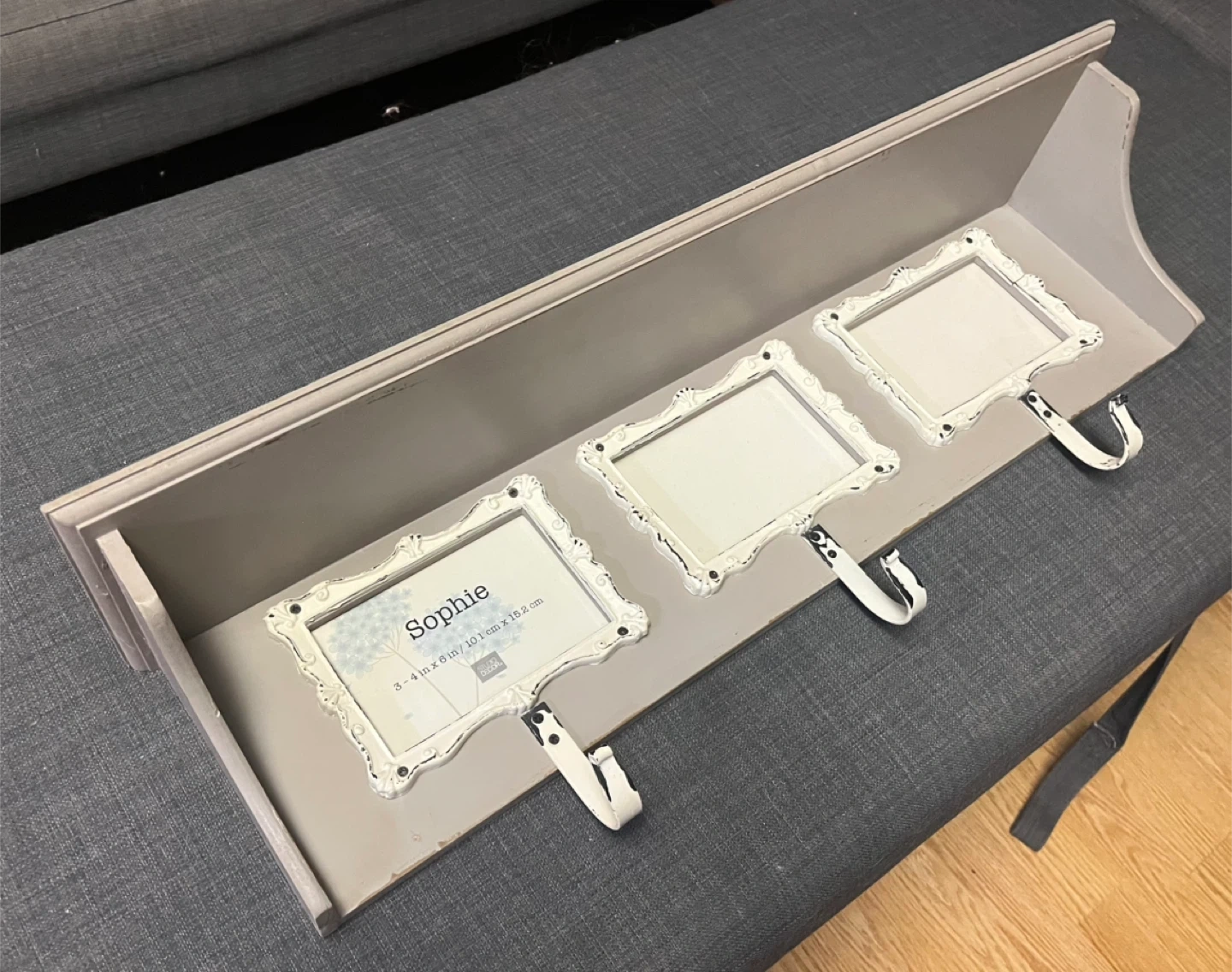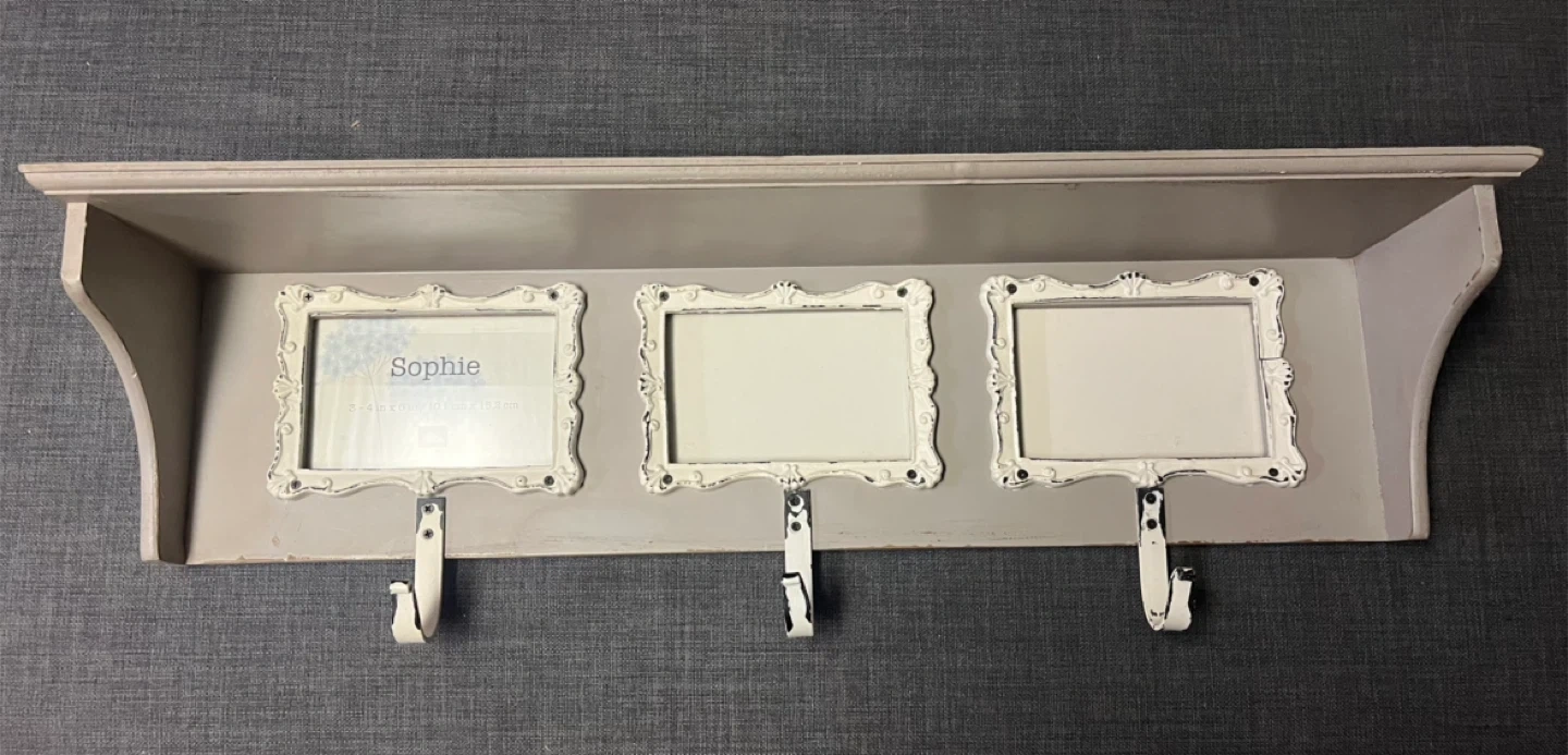 Rustic style shelf with hooks and three photo places with glass to hang and decorate your home. Purchased from Michael’s Canada for $89.99 six years ago and letting for for $50.