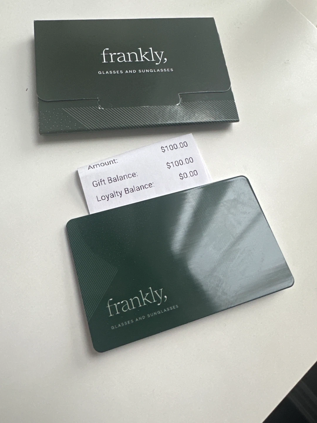 Selling a Frankly, Glasses and Sunglasses giftcard with a $100 balance! It's perfect for treating yourself or gifting to someone special who loves stylish eyewear.