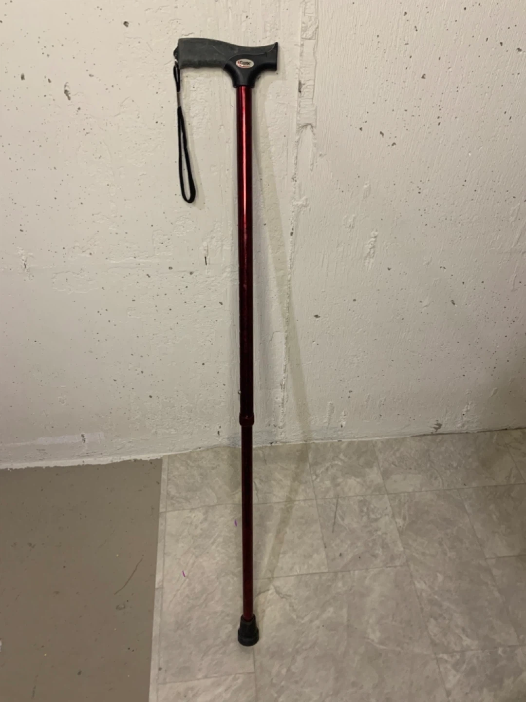 Selling a Carex walking cane in burgundy. It has a comfortable grip and a convenient wrist strap. It is adjustable in height to suit your needs. Great for anyone needing a bit of extra support!