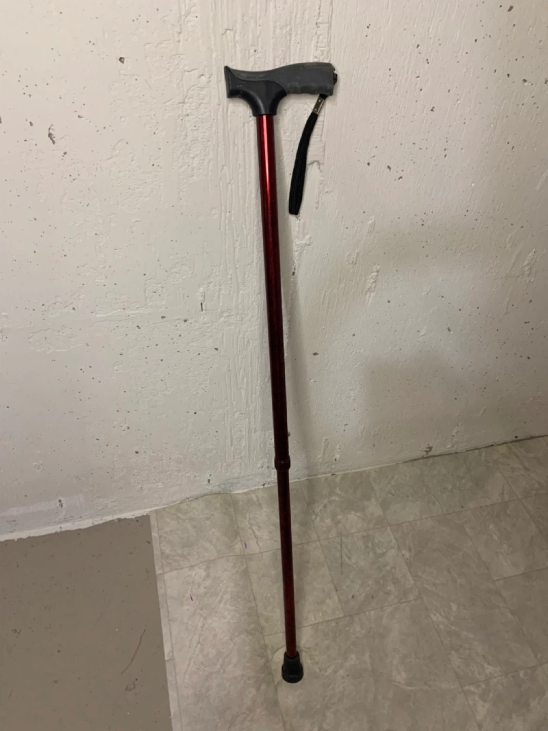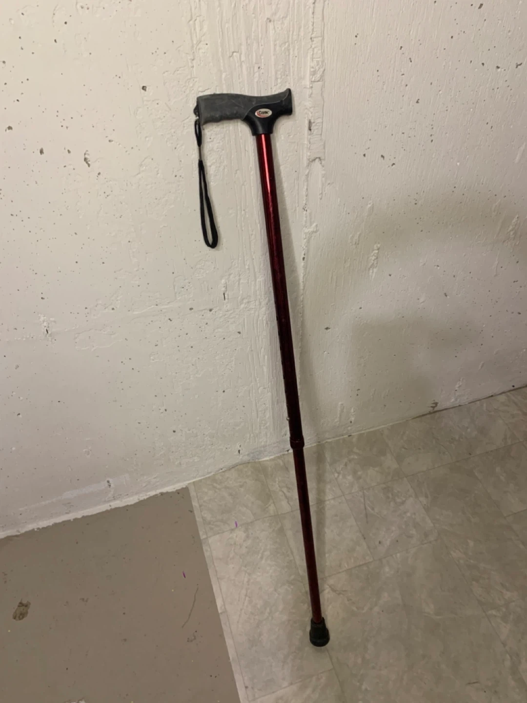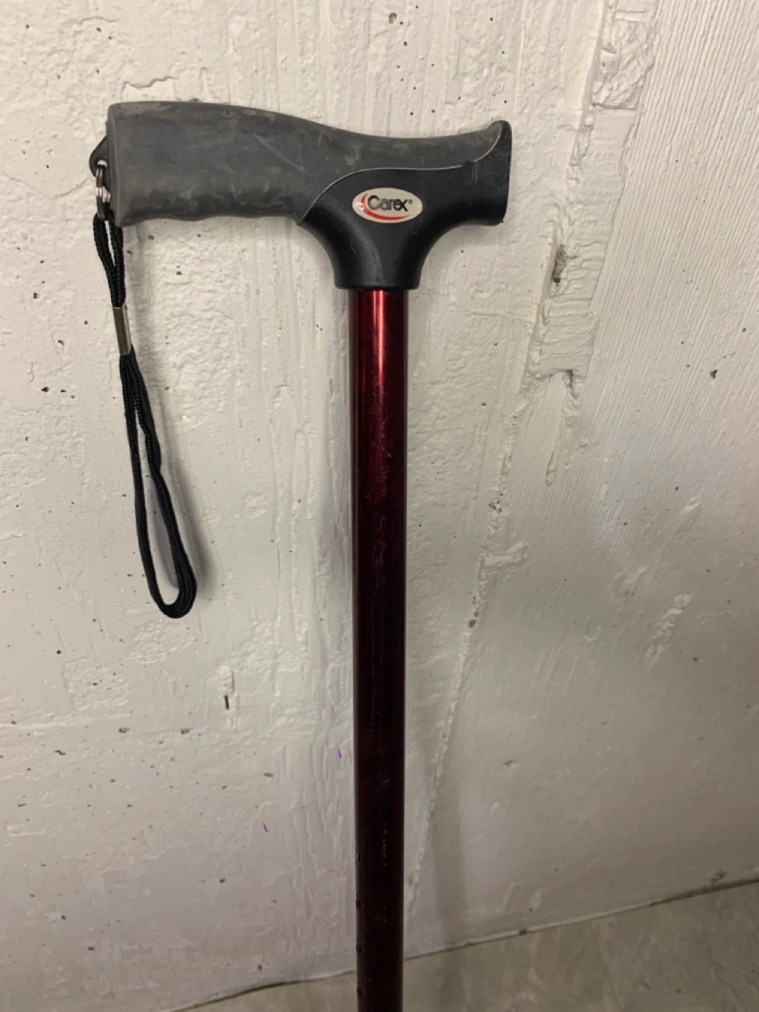 Selling a Carex walking cane in burgundy. It has a comfortable grip and a convenient wrist strap. It is adjustable in height to suit your needs. Great for anyone needing a bit of extra support!