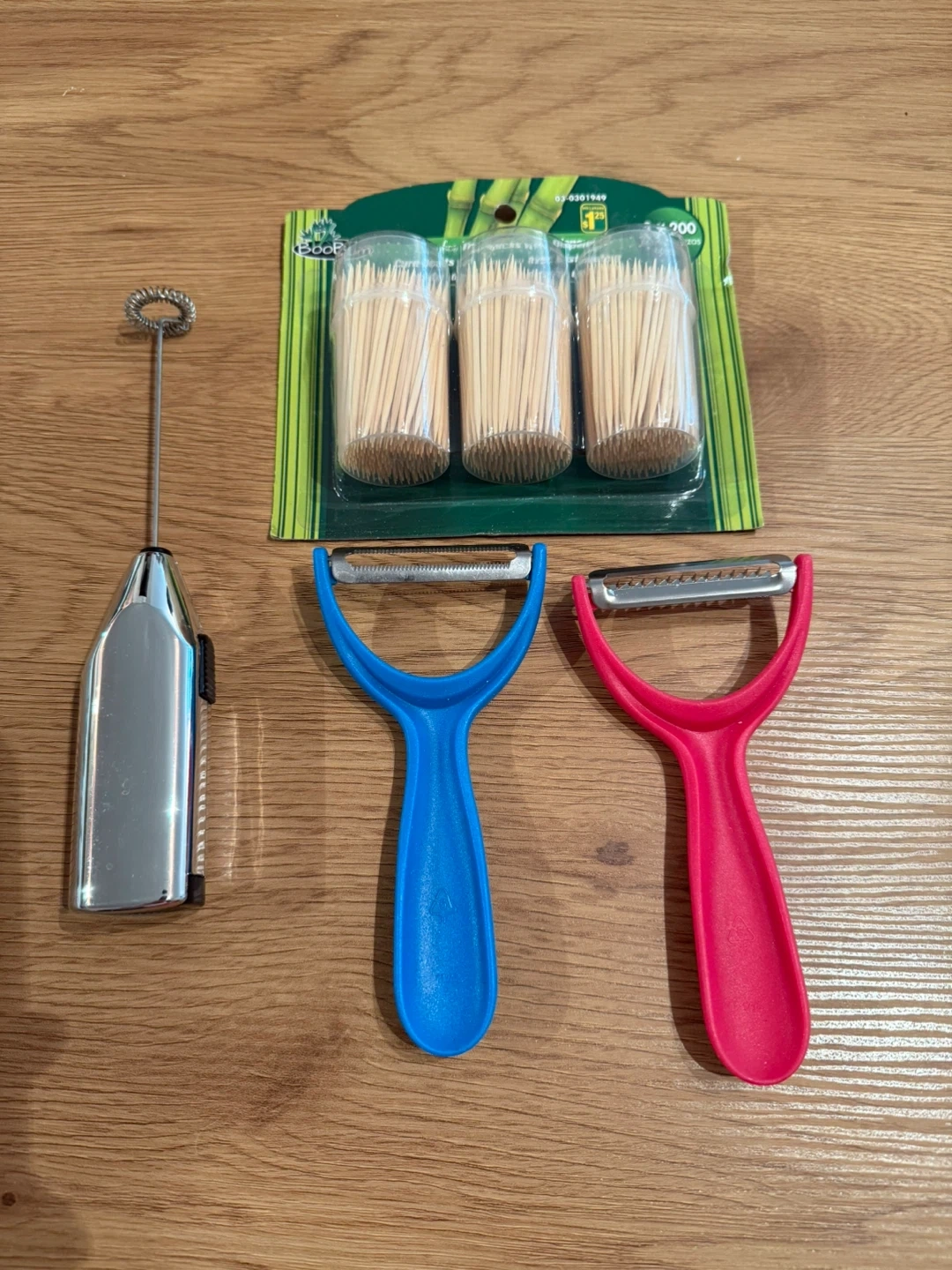 Giving away a set of kitchen items including toothpicks, a milk frother, and two peelers. Pick up only