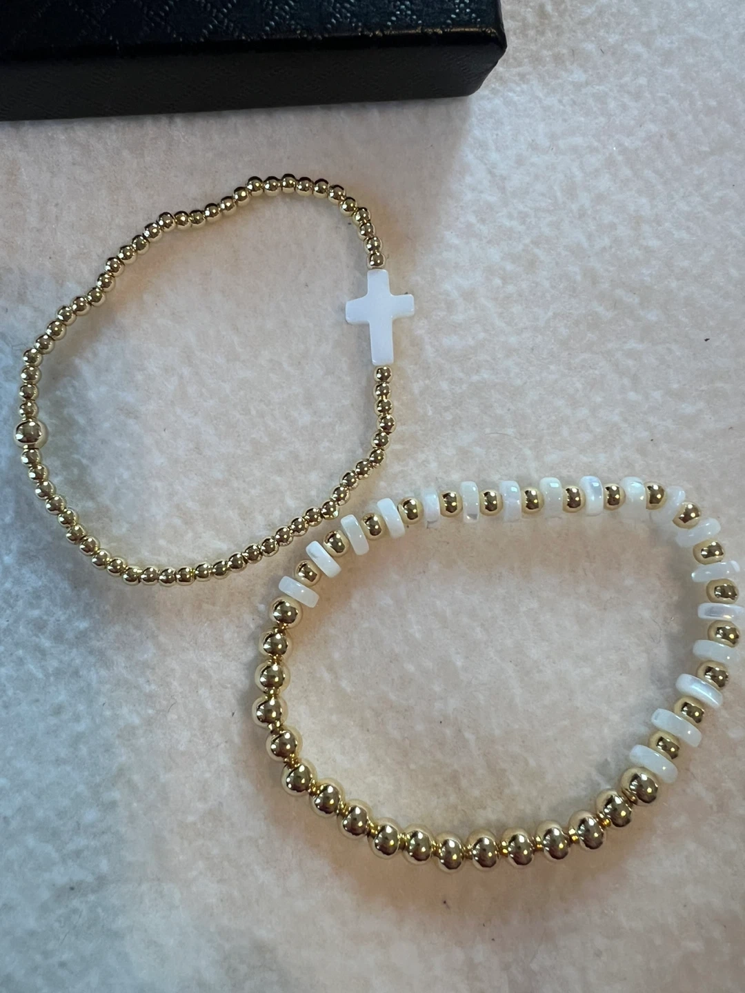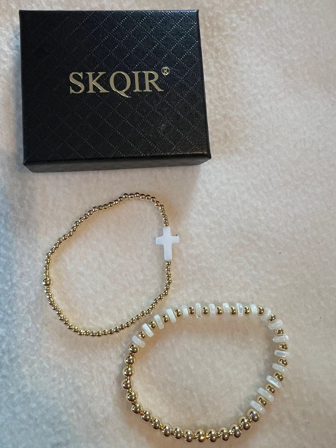 Selling a set of two SKQIR beaded bracelets. One is gold with a white cross, and the other is gold with white beads. They come with the box!