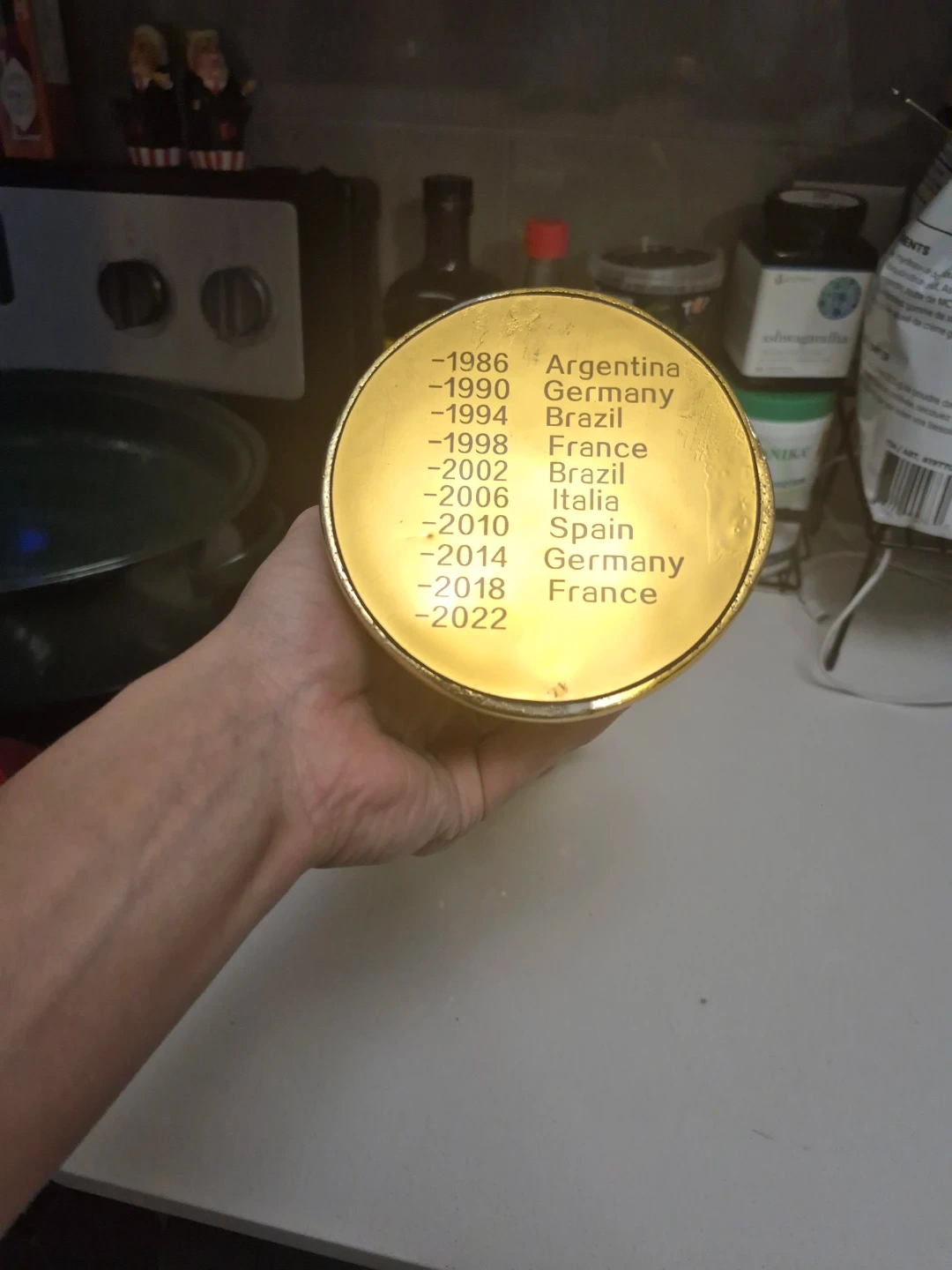 Buy & SellFIFA World Cup Trophy ReplicaFIFA World Cup Trophy Replica$25Selling a replica of the FIFA World Cup trophy. It's a great piece for any soccer fan. The base lists the winners from 1986 to 2022.ConditionLike newWHERE TO MEEThigh parkView MapSELLERverifiedSamuelHigh Park N1054 reviews1 chats·3 favorites·42 viewsSEND CHAT TO SELLERHi Samuel! I’m interested in your listing.Hi Samuel! I’m interested in your listing.Get the Karrot app to chatSign In to chat