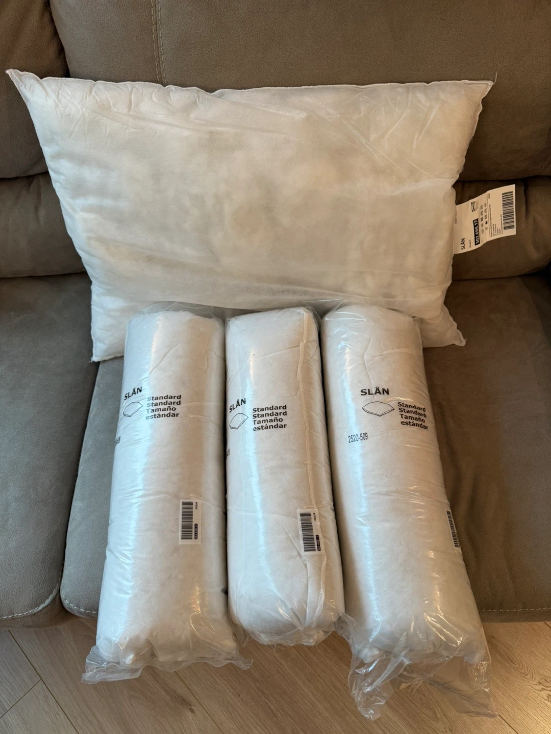 Selling a set of IKEA SLAN standard pillows. Includes three pillows still in their original packaging and one opened but never used.