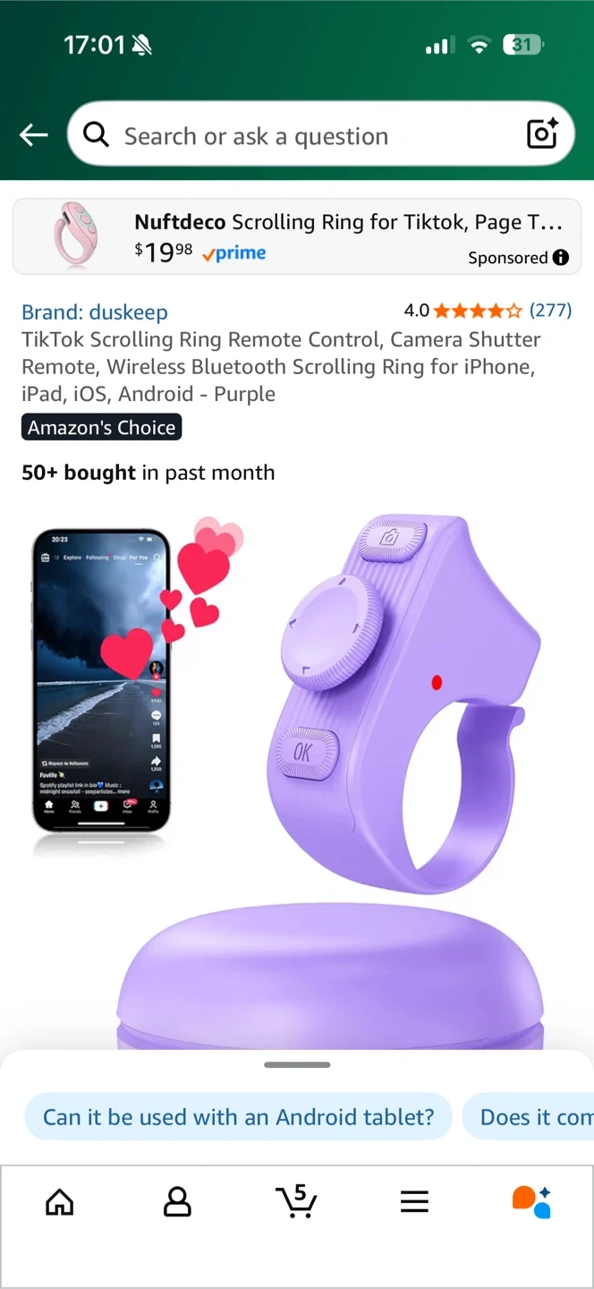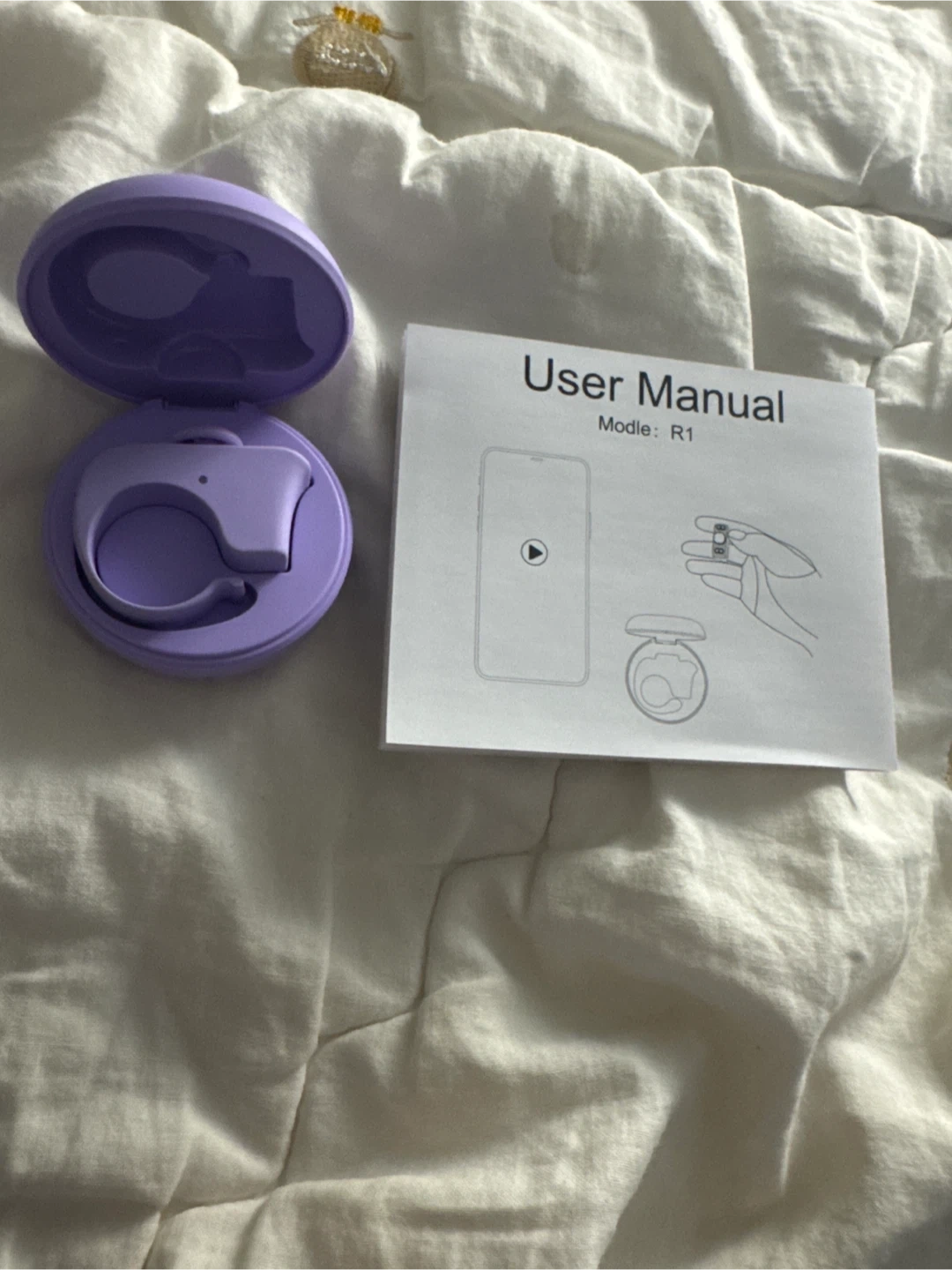 Selling a duskeep Nuftdeco Scrolling Ring for TikTok. It's a camera shutter remote and wireless Bluetooth scrolling ring for iPhones, iPads, iOS, and Android devices. It comes in a cute purple colour and includes the user manual and charging case!