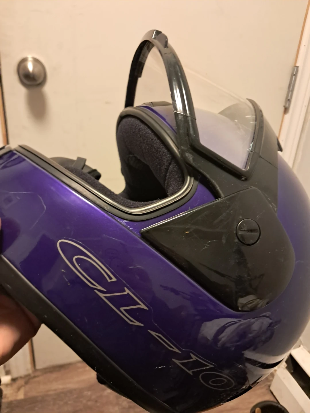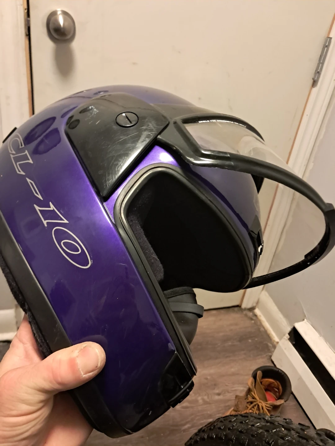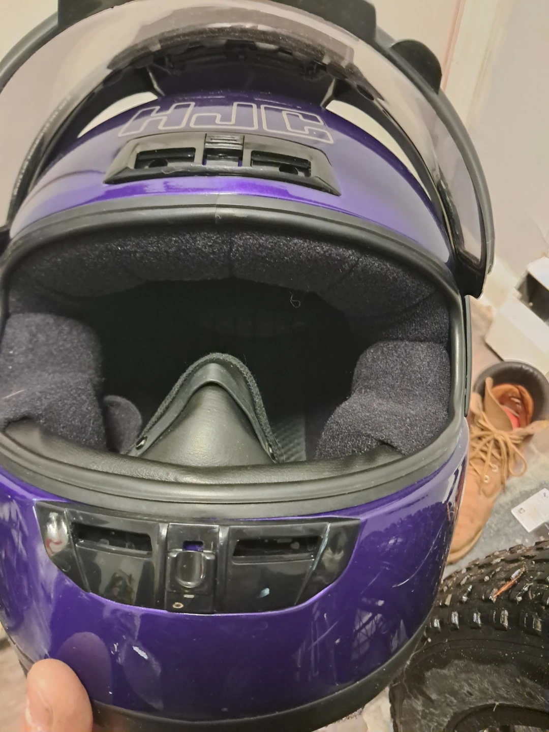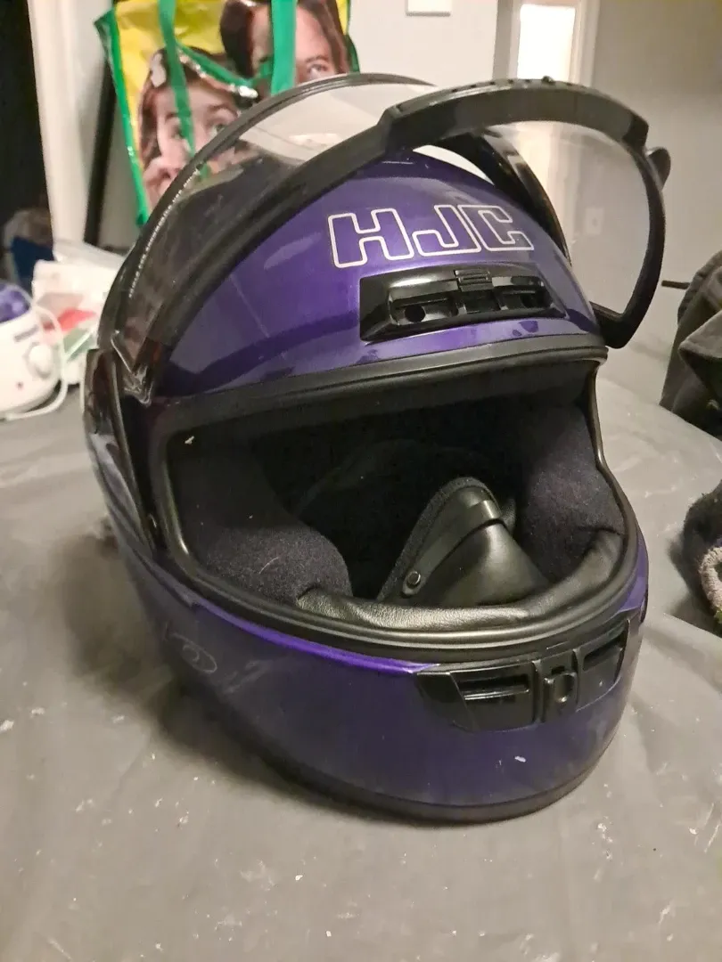 Selling a purple HJC CL-16 snowmobile helmet. It has some signs of wear, but is still in good condition and ready to use. It has a clear visor and a comfortable interior padding. Perfect for anyone looking for a reliable helmet!