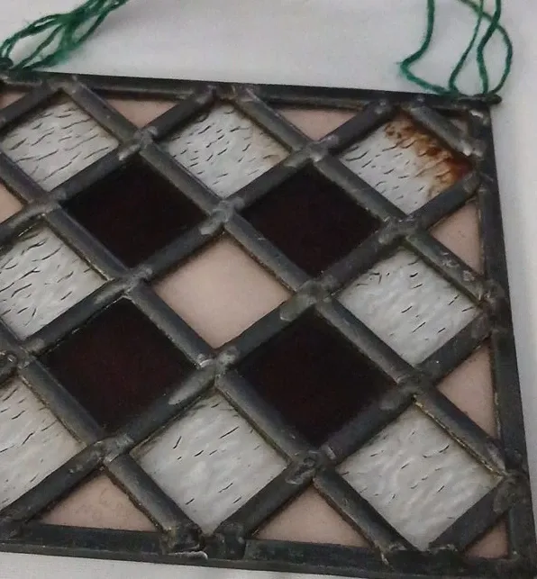 A lovely stained glass window hanging, perfect for adding a touch of charm to any room! It features a diamond pattern with a mix of clear, white, and brown glass. It's in great condition and ready to brighten up your space