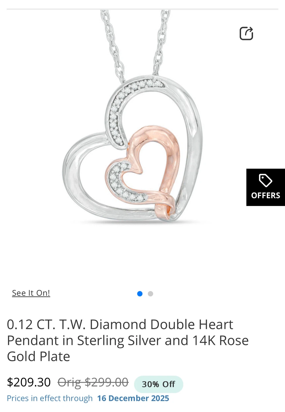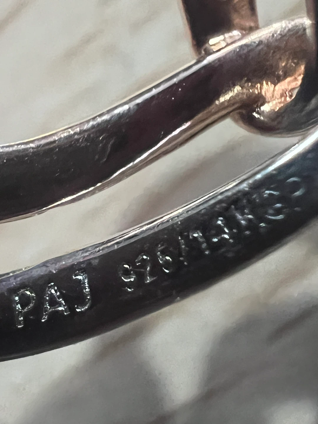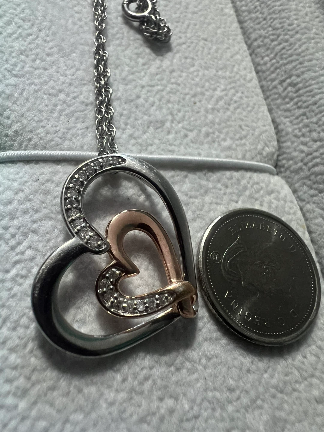 It's in great condition and features a double heart design with silver and rose gold tones. Perfect for adding a touch of sparkle to any outfit