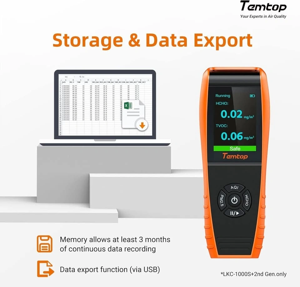 Temtop Indoor Air Quality Monitor PM2.5 PM10 Formaldehyde(HCHO) AQI Temperature Humidity Meter Particle Counter tVOC Sensor Air Pollution Detection w/Data Export for Office Wildfire (LKC 1000S+2nd)