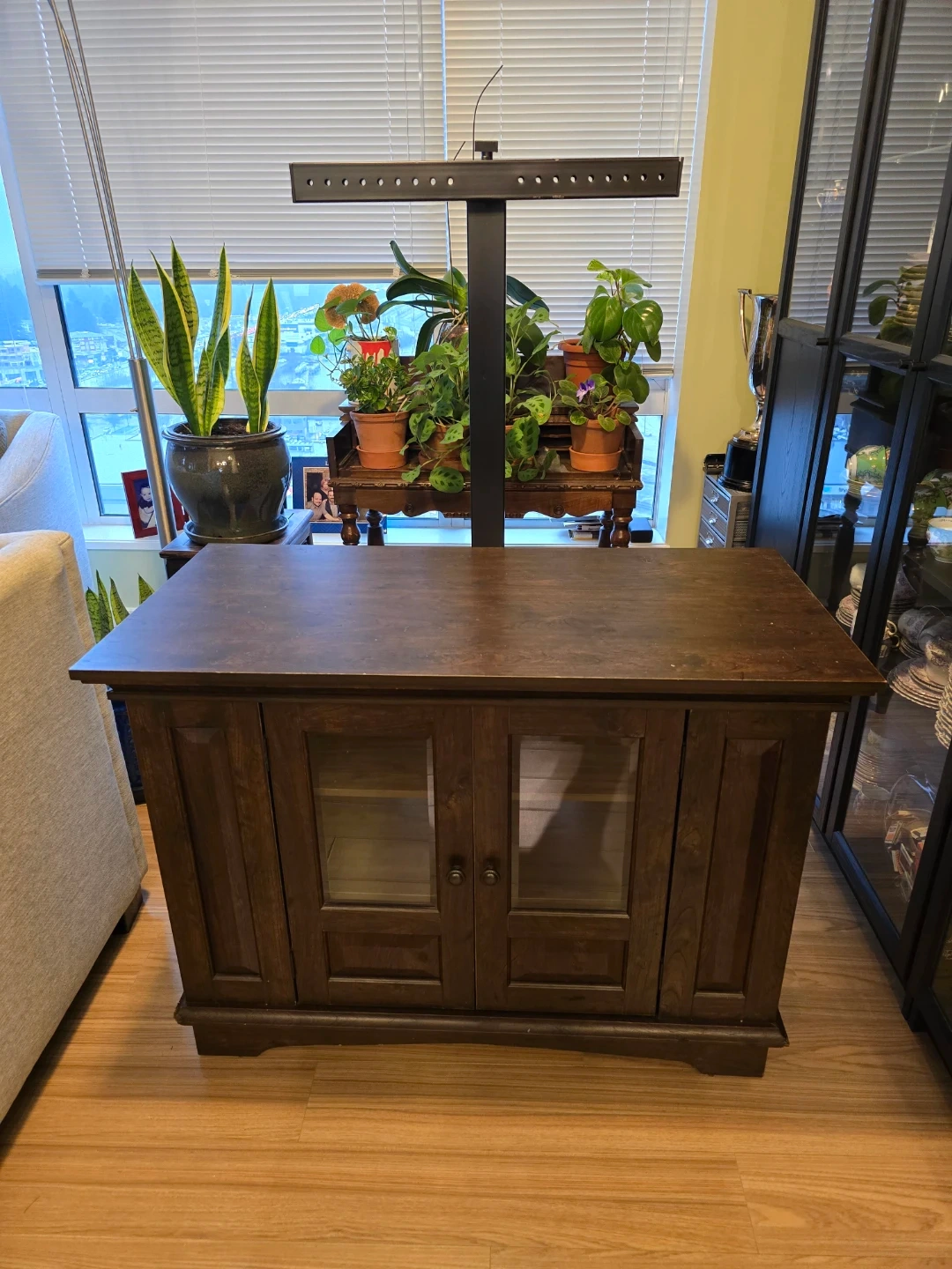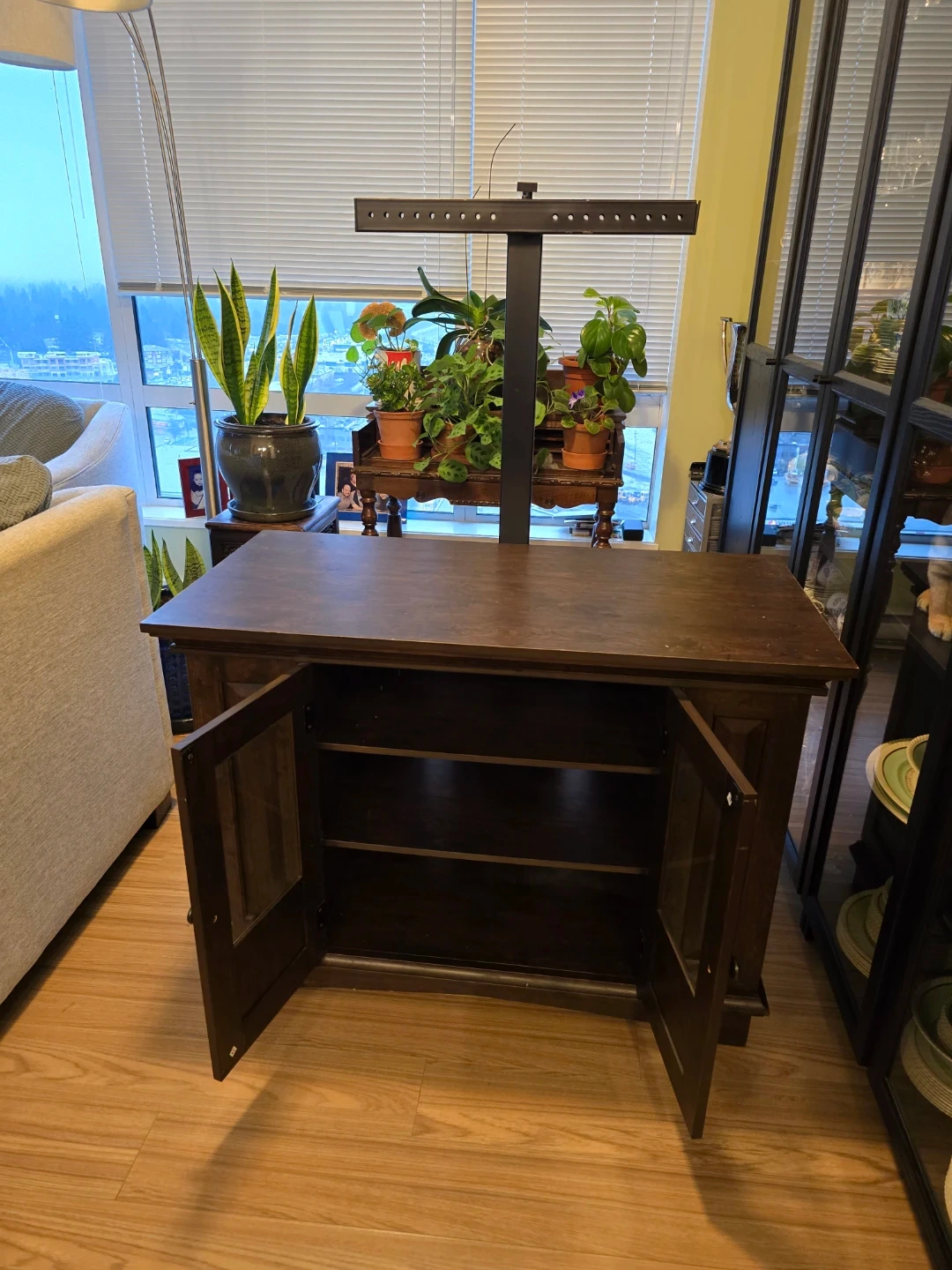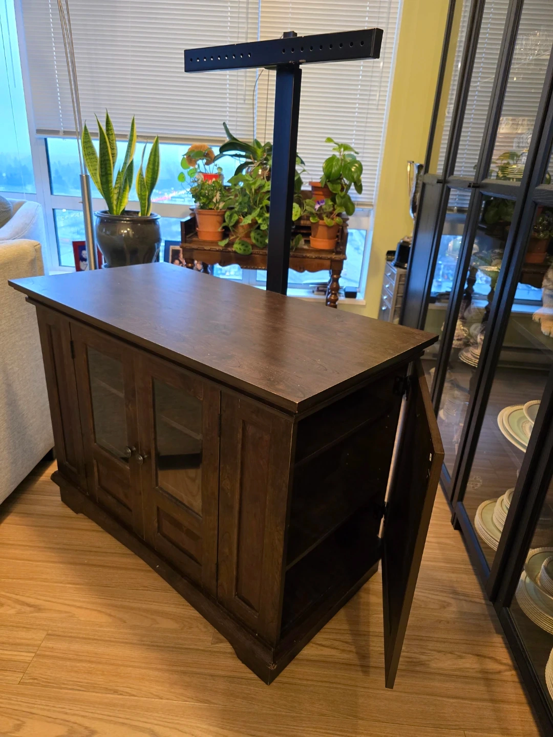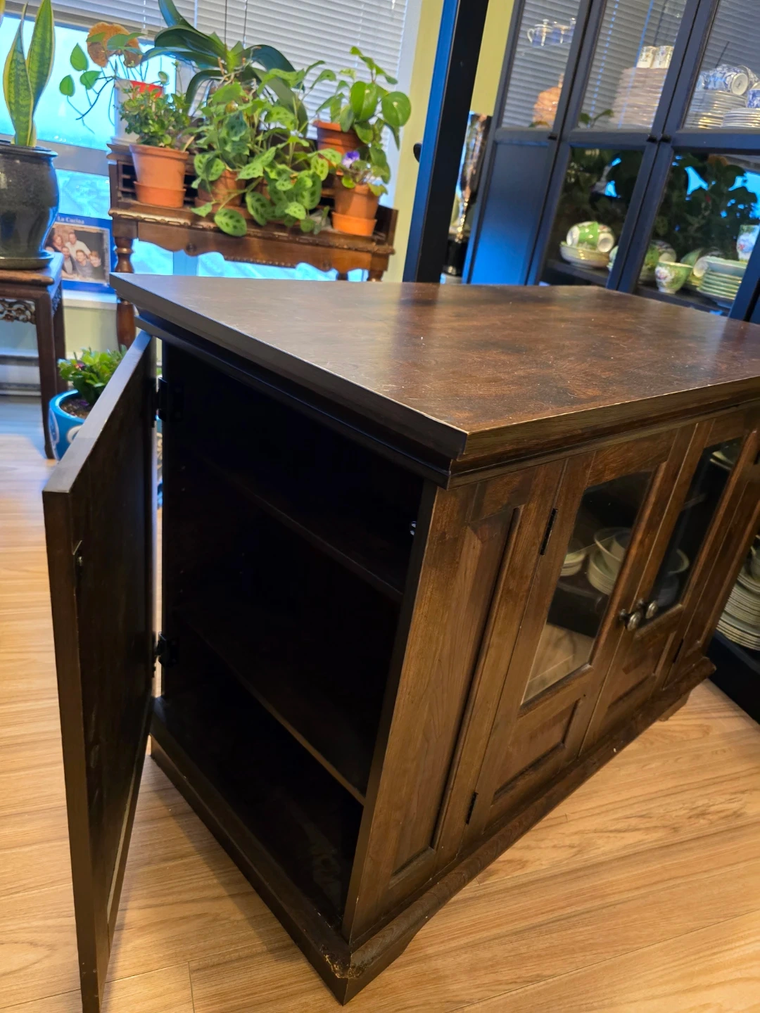 Selling a dark brown wooden TV stand. It features glass doors and open shelving for storage and TV bracket. It's in good condition and ready for a new home!