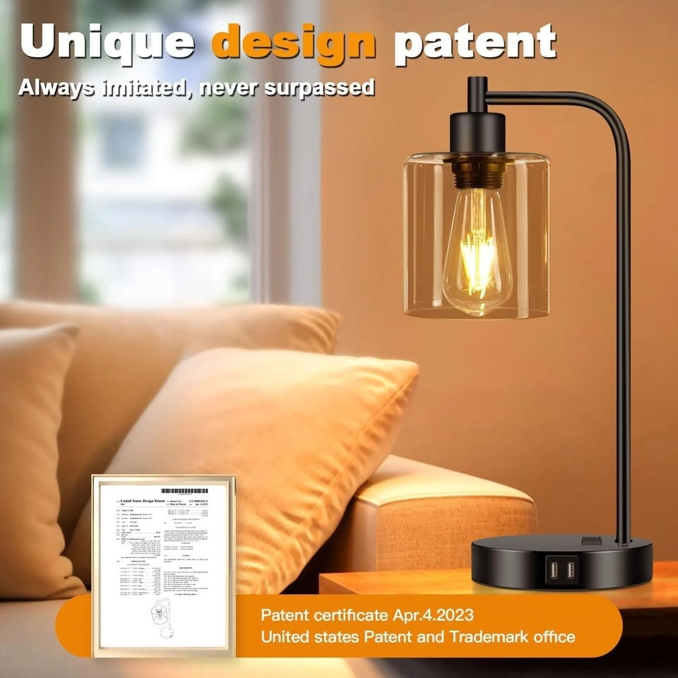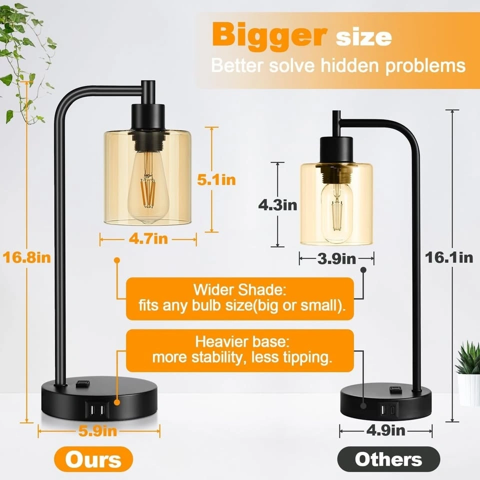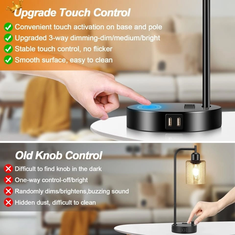 Set of 2 Industrial Touch Control Table Lamps with 2 USB Ports and AC Outlet - 3-Way Dimmable Black Bedside Lamp Nightstand Desk Lamps for Bedroom Living Room, Amber Glass Shade & 2 LED Bulbs Included