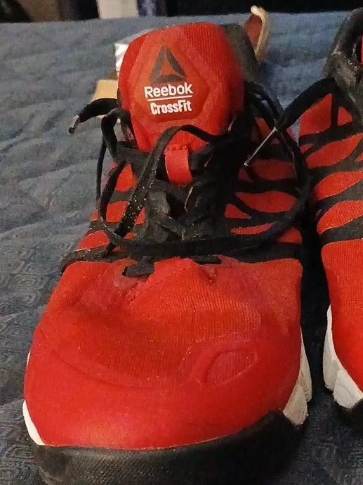 Selling a pair of Reebok CrossFit athletic shoes. They are red with black accents and have some wear and tear. Great for cross-training!