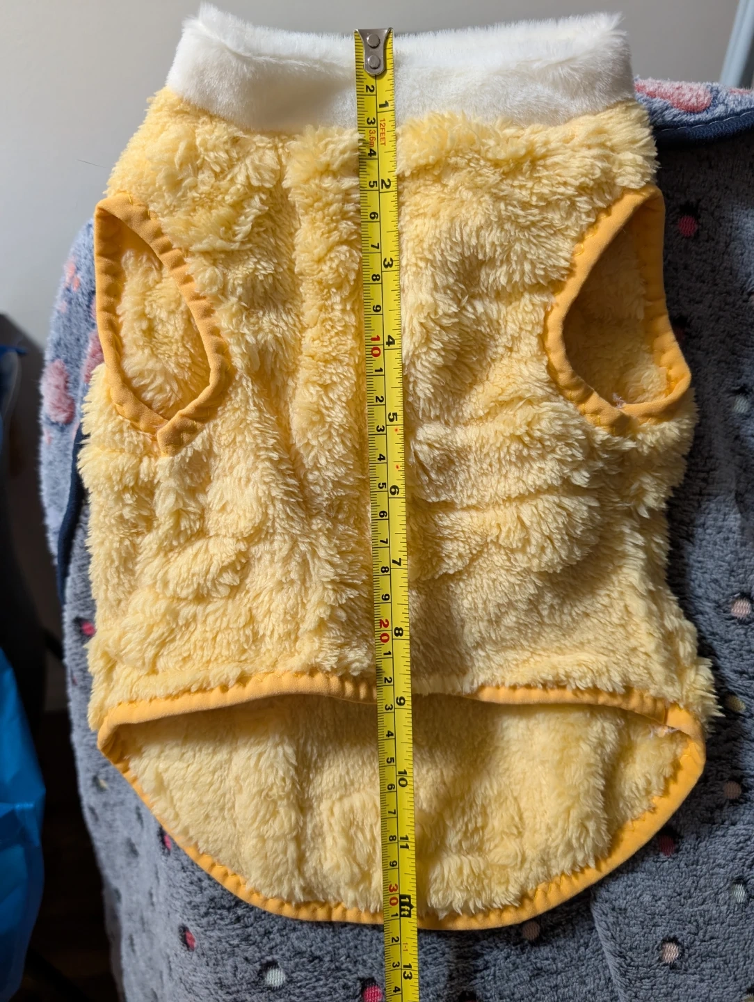 This adorable fluffy yellow fleece dog vest is perfect for keeping your furry friend warm! It's in great condition and is approximately 9 inches wide and 13 inches long. It was listed as a size L but I'm not sure if that's accurate. I bought it for my cat and he's 16 lbs. It wasn't long enough in the body for him. It was only tried on once.