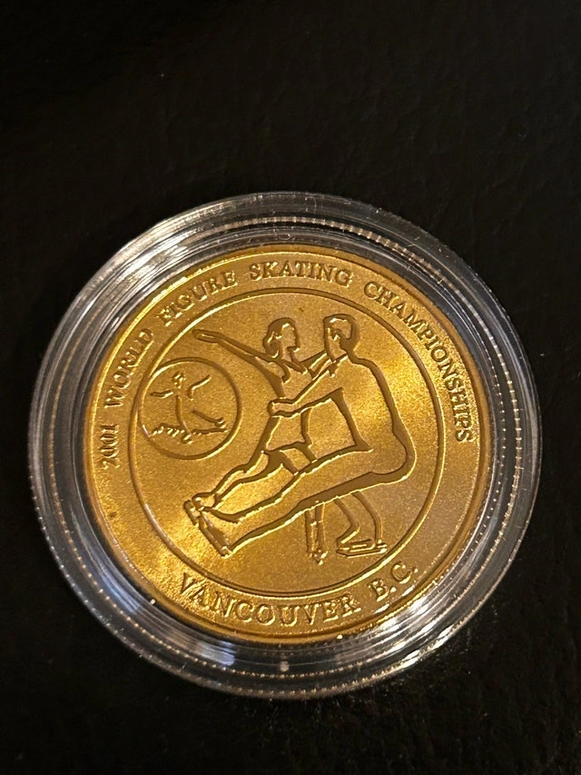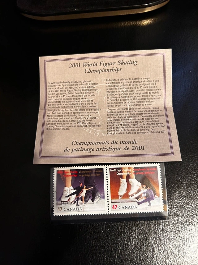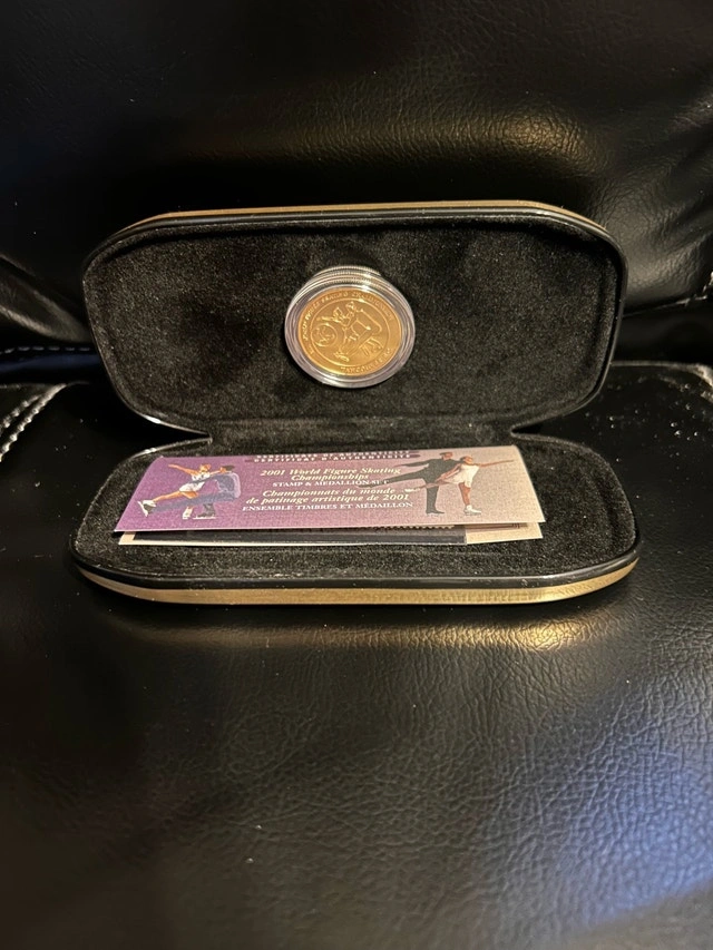 This is a 2001 World Figure Skating Championships stamp and 24K gold-plated medallion set, still in its original presentation tin. It's a cool collectible for any figure skating fan! Cash only Pickup in East York