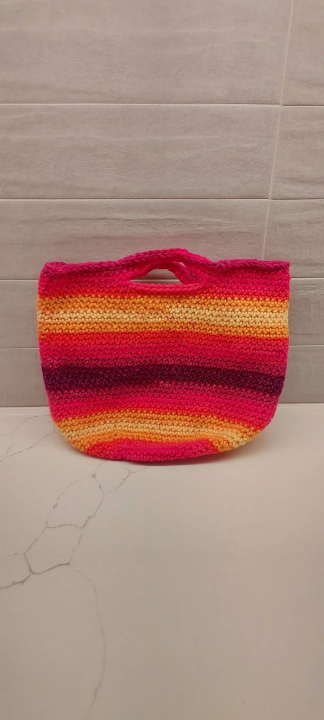Bright pink/orange sunset striped crochet bag with a built-in handle. Great for quick errands or a lunch bag.