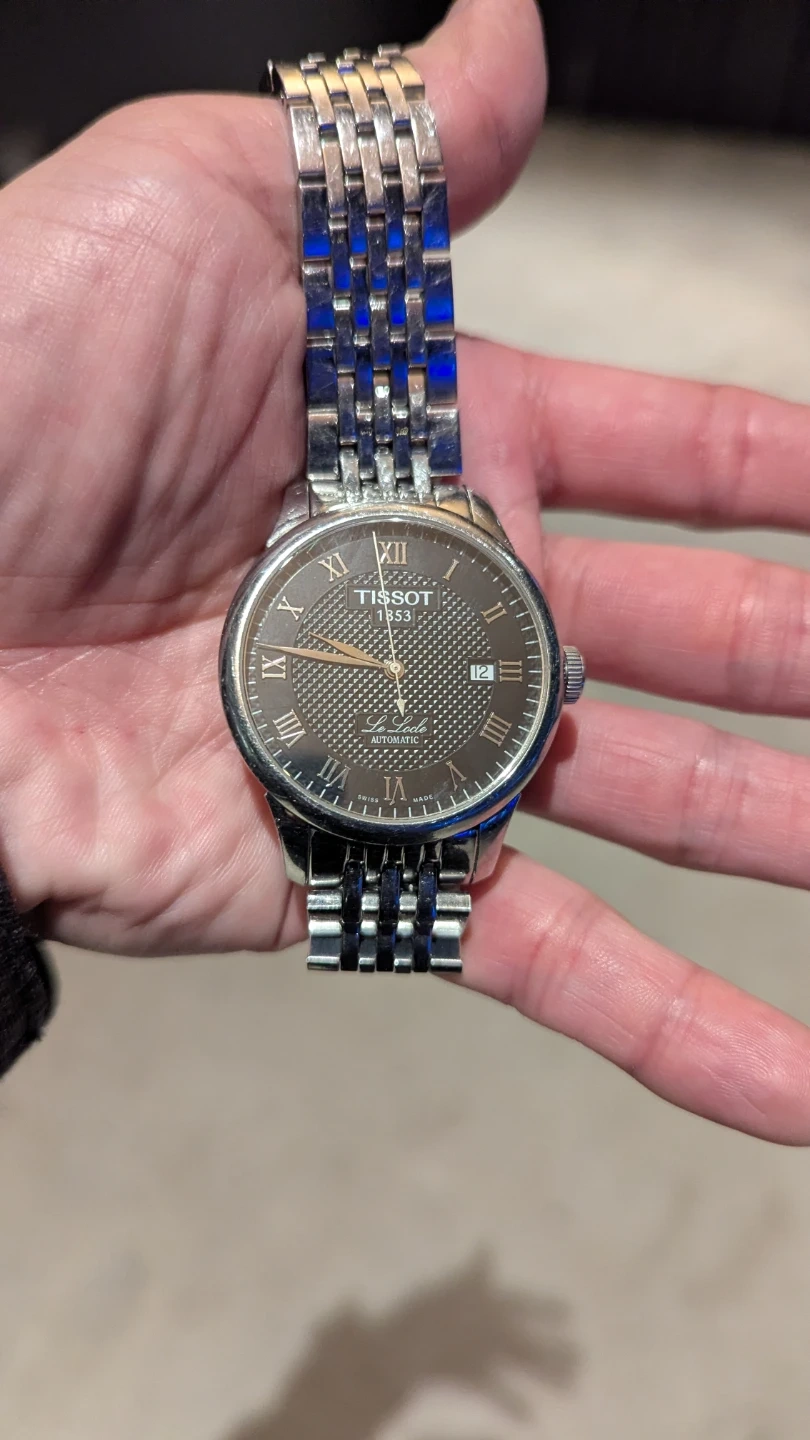 Selling a Tissot Le Locle automatic watch. It's in good condition and has a classic look. The watch features a silver bracelet and a brown dial with Roman numerals. It's a stylish timepiece for any occasion!
