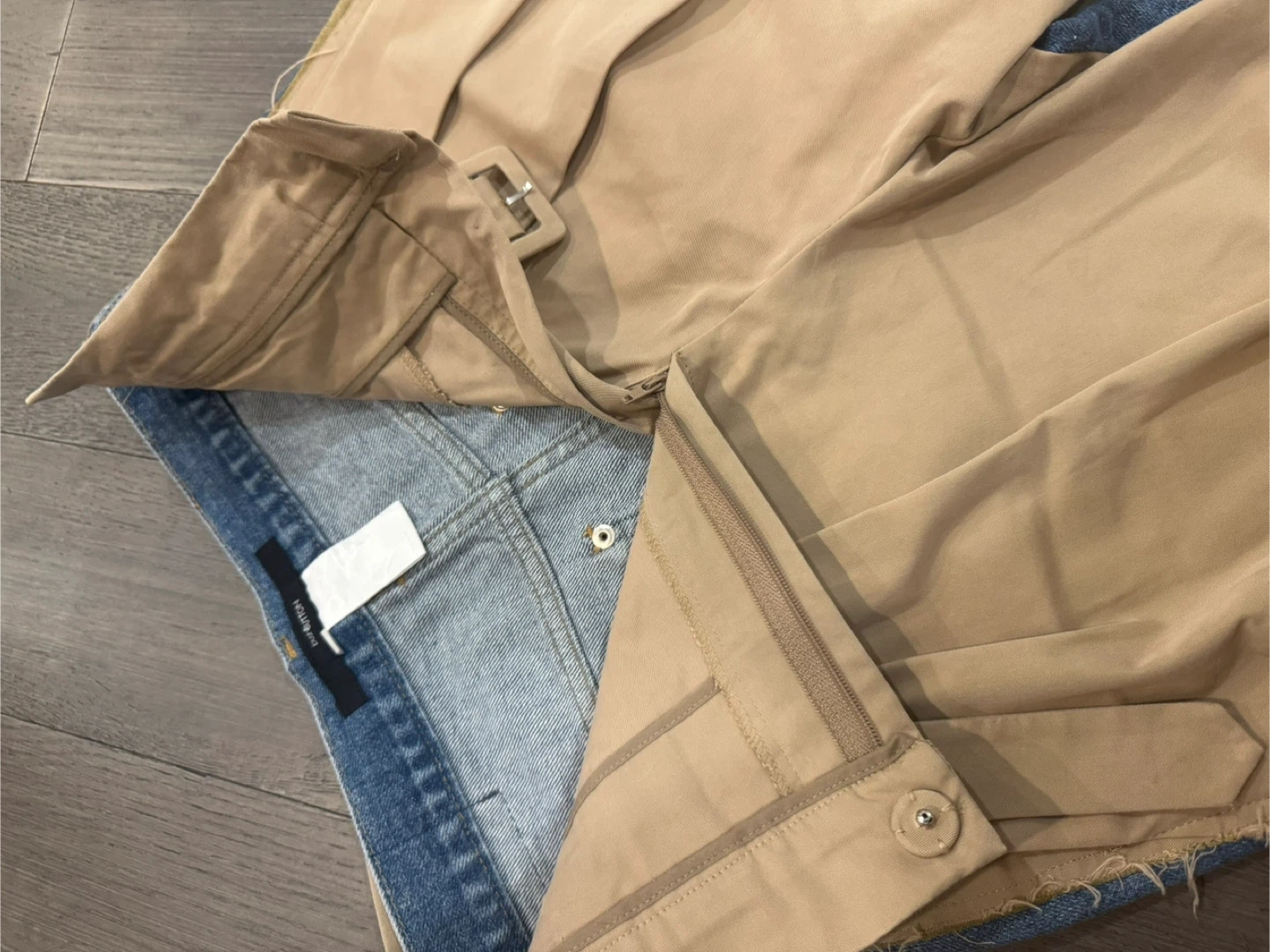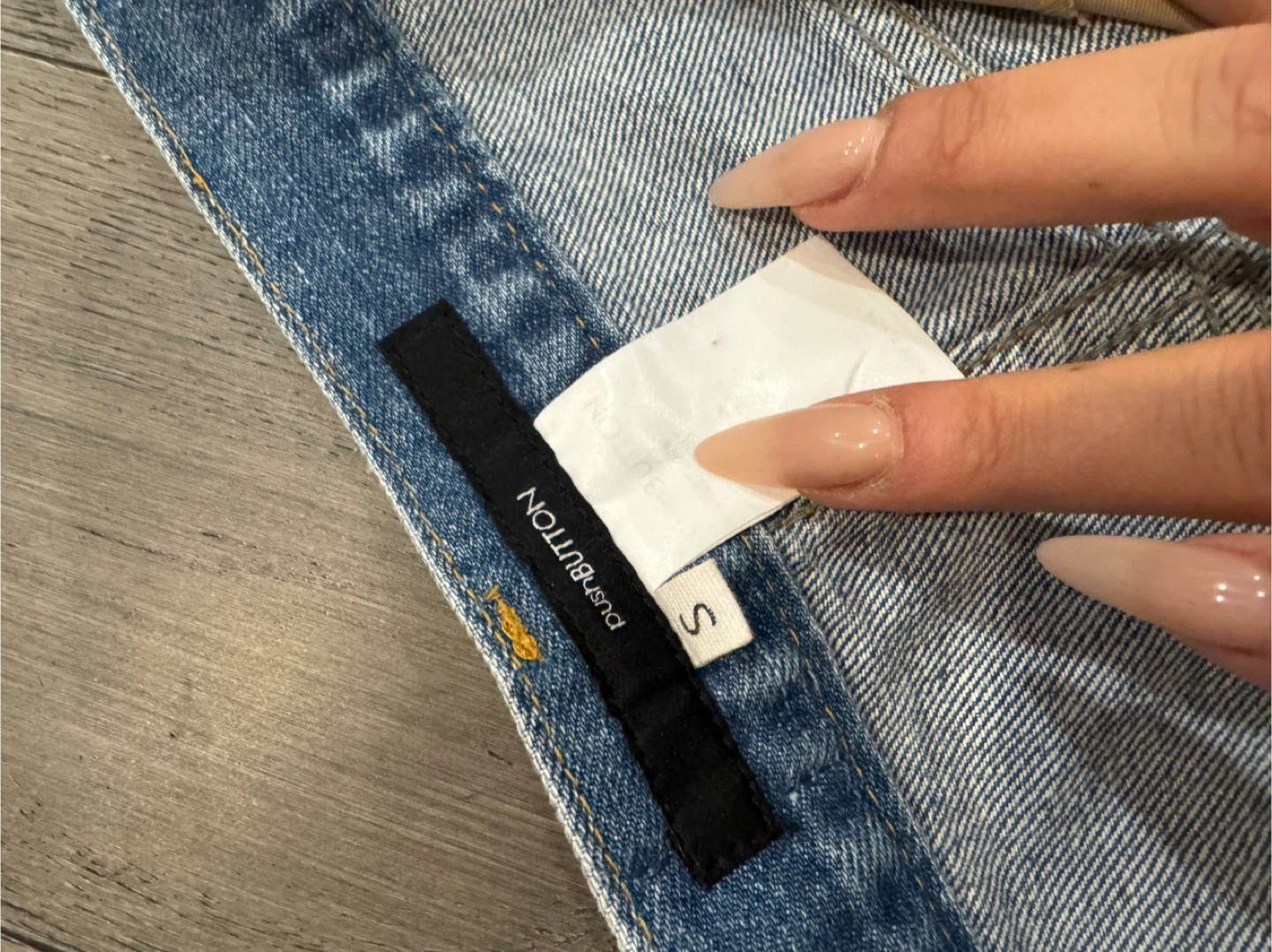 Selling a pair of PUSHBUTTON pants! These are a unique design with a beige top layer and denim underneath. Size small. They’re in great condition! The jeans shown in the image are made by the brand Pushbutton, specifically a vintage or unique design style that may also use the name PUSHU Co.. The leather patch includes text "WORLD WIDE COMPANY" and "PUSH THE BUTTON" with graphics, which are elements associated with the brand. Pushbutton is a Seoul-based fashion label known for its quirky, genderless, and vintage-inspired designs that often incorporate unique detailing and innovative textiles. The founder, a former K-Pop star, named the label after Madonna's song "Hollywood" lyrics.