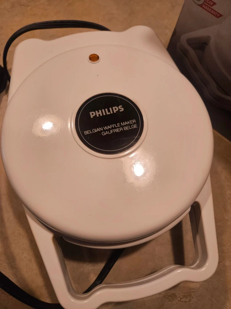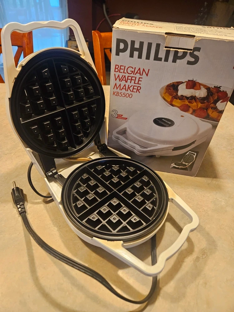Selling a Philips Belgian waffle maker, model KB5500! It makes deep, delicious Belgian-style waffles in minutes. The extra deep indents are perfect for holding your favourite toppings. It also has a non-stick finish on plates for easy clean up and a cool touch exterior. The compact design with cord wrap stands upright for convenient storage. Like new!!!