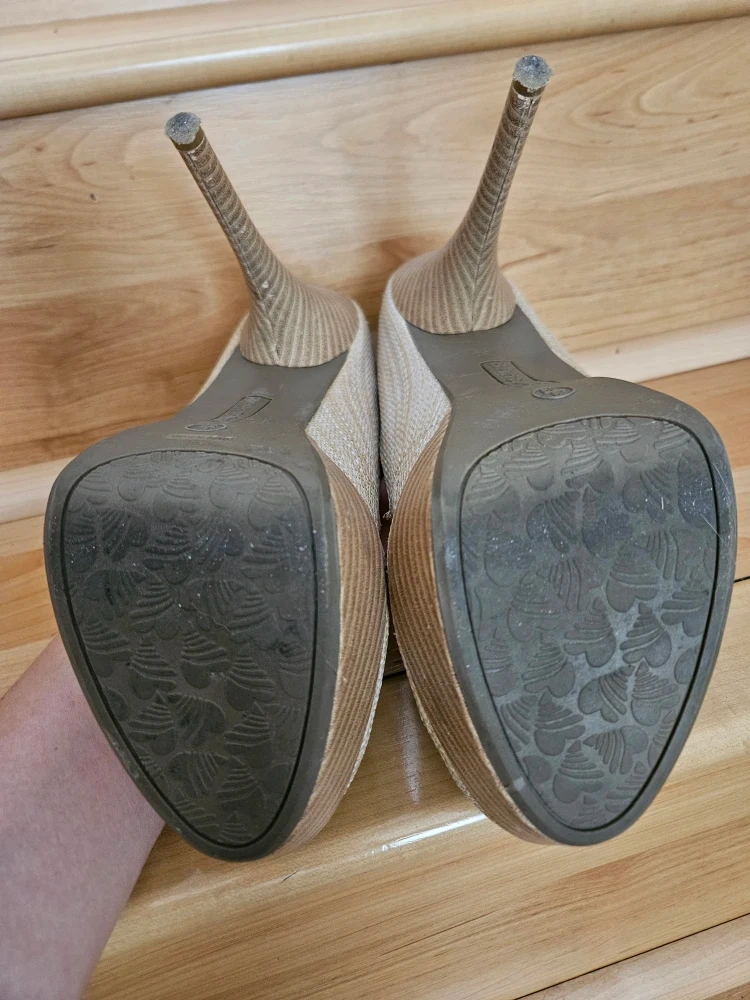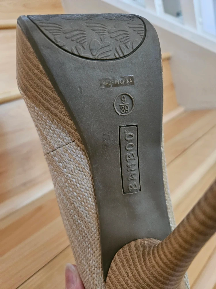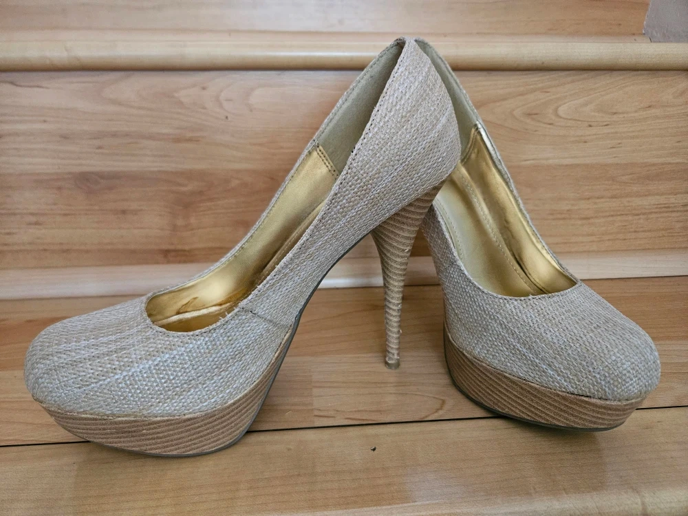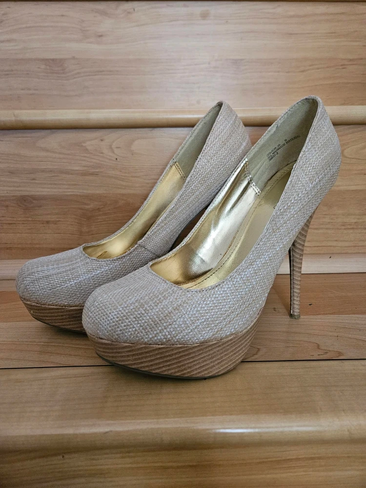 Selling a pair of Bamboo heels in a size 9. They have a woven texture and a gold interior. The heels are in good condition.
