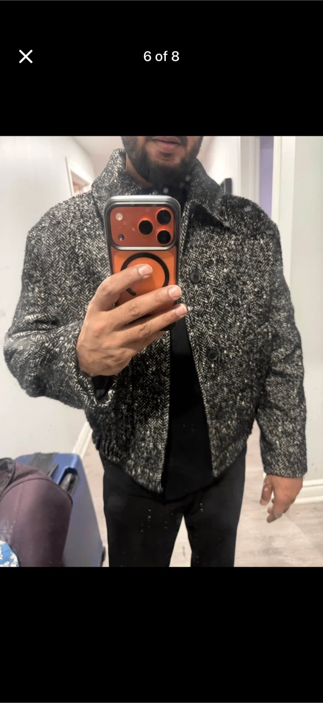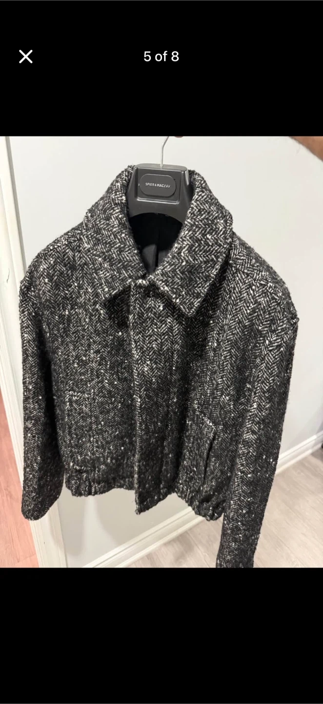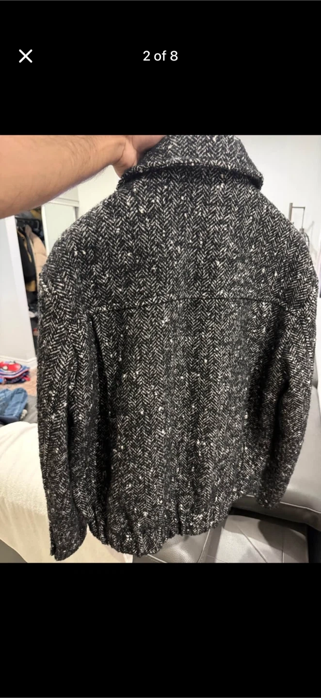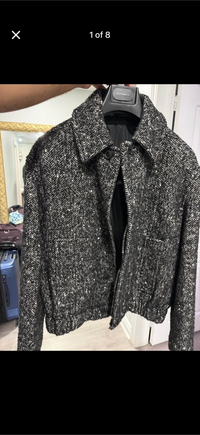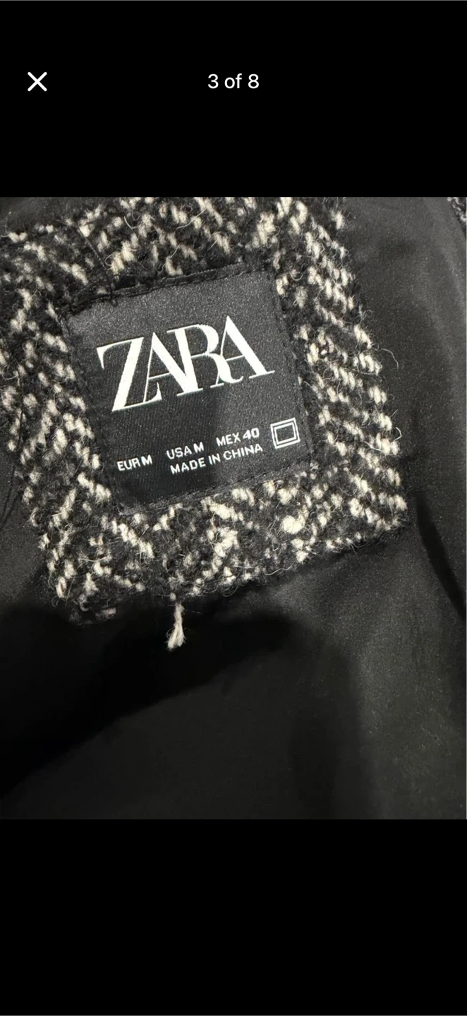 Selling a stylish Zara jacket with a unique herringbone pattern! It's a size medium and in great condition. Perfect for adding a touch of sophistication to your wardrobe