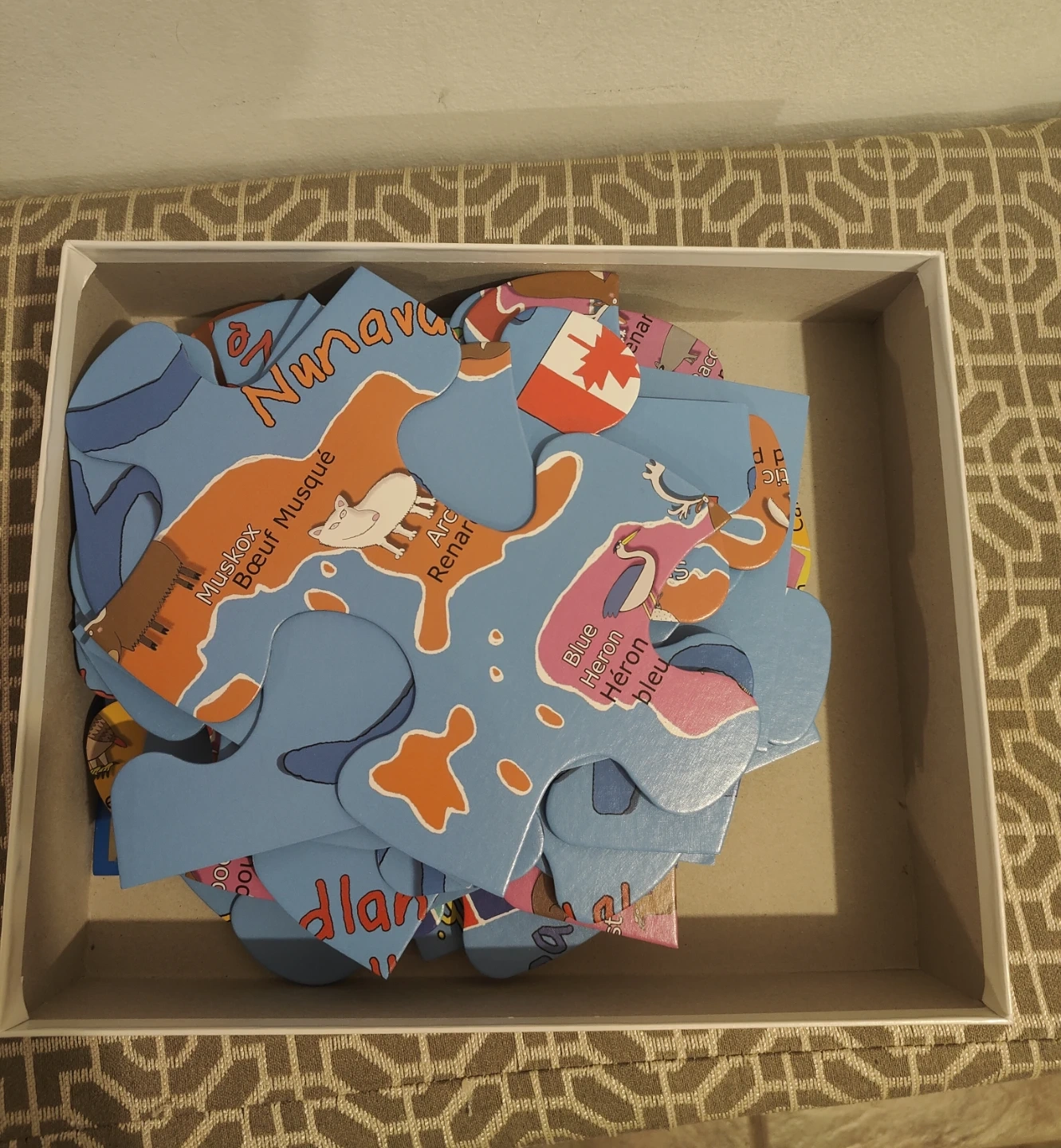 Selling a Ravensburger Canada map puzzle! It's a super-sized floor puzzle with 24 pieces, measuring 3x2 feet (90x60 cm). The puzzle is designed for ages 3+ and features an easy-clean surface. It comes with the original box