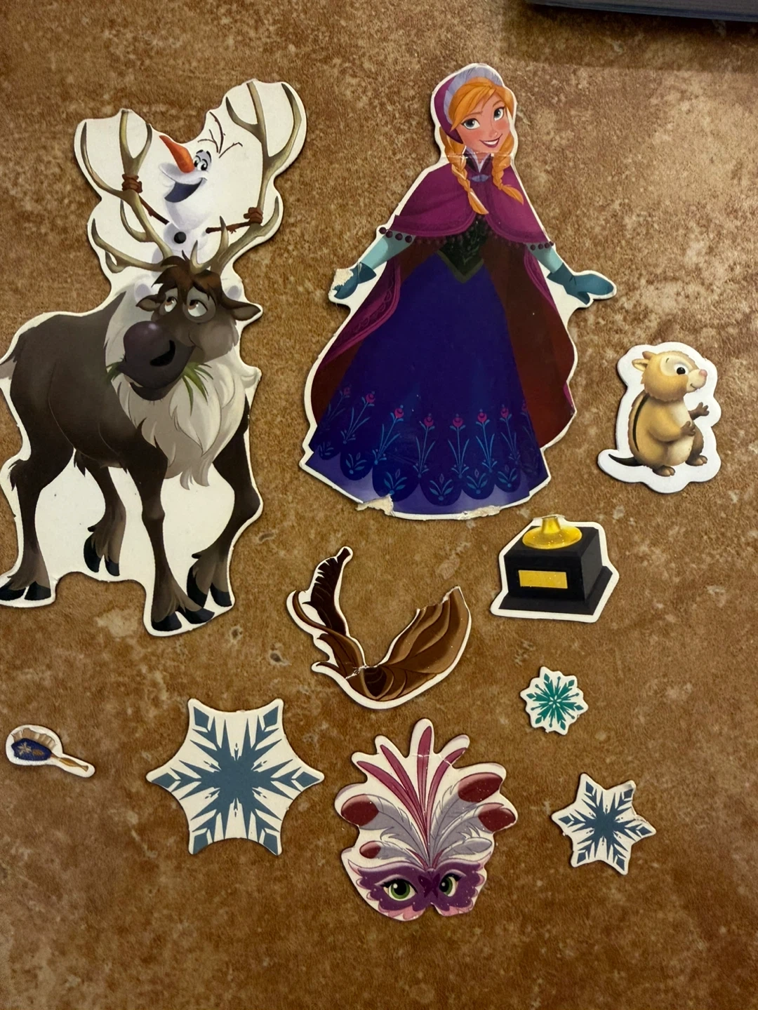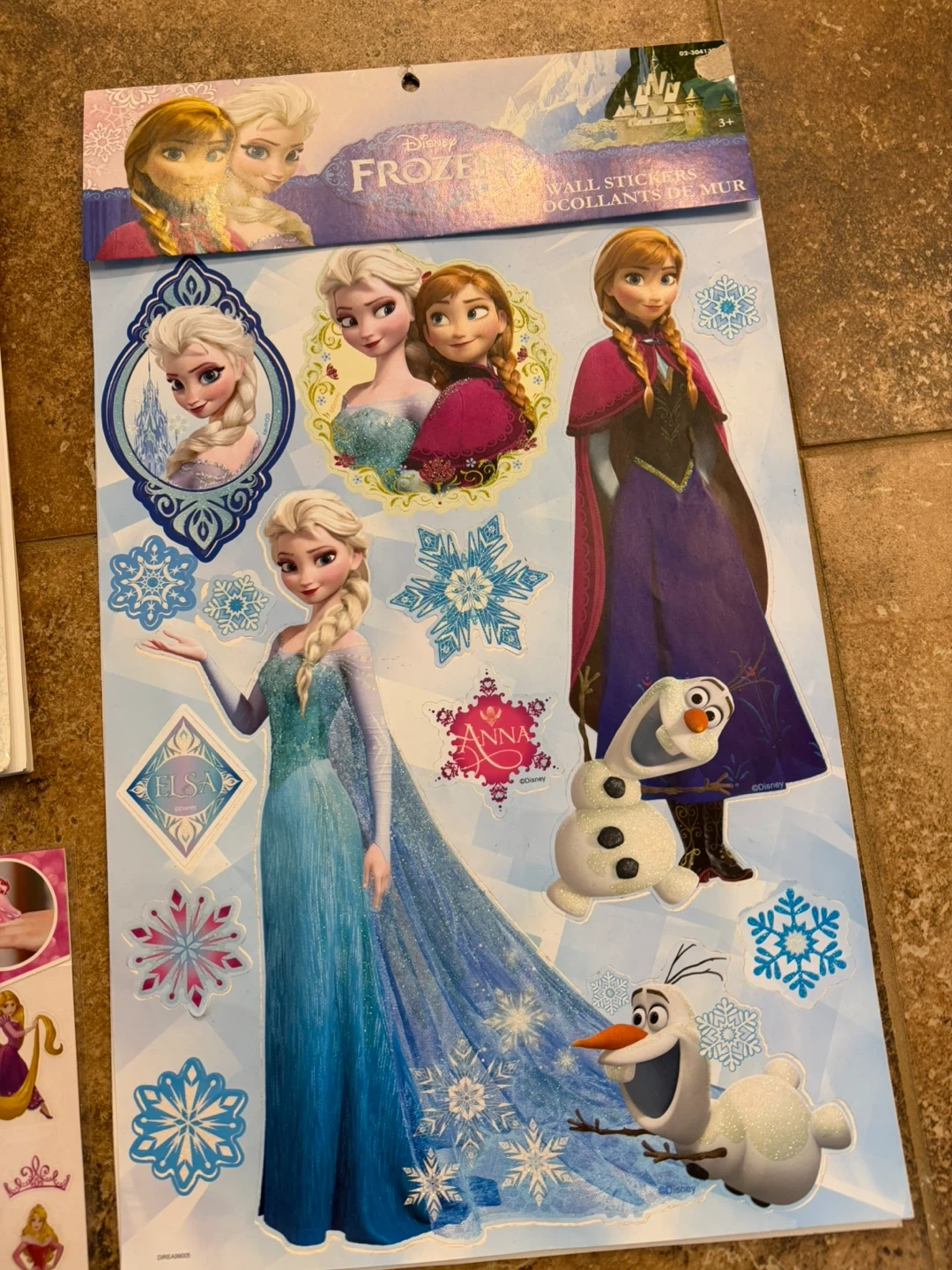 This Disney Frozen package includes a Frozen sticker book treasury and Frozen wall stickers, alongside Disney Princess pop up stickers and 10 magnets. items are used , wall stickers & pop up stickers are new. Package includes