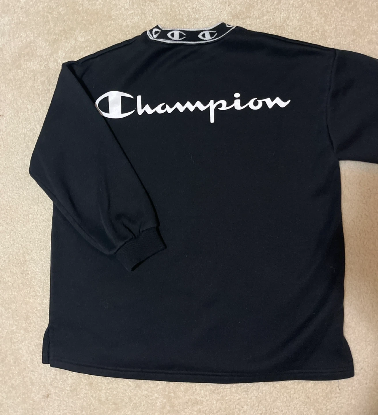 Selling a Champion long sleeve shirt in black. It has the Champion logo across the chest and a patterned design around the collar. A great addition to any wardrobe!