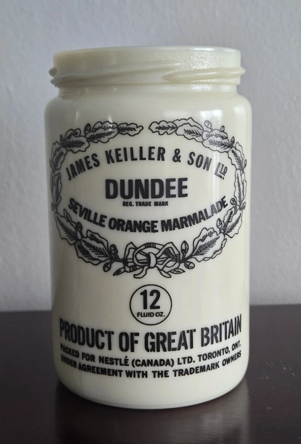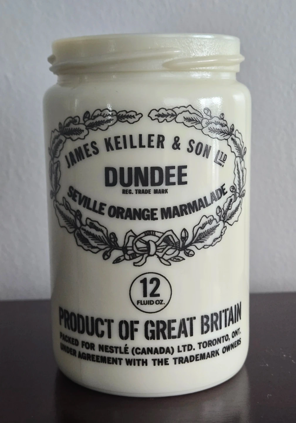 Selling a vintage James Keiller & Son Dundee Milk Glass Orange Marmalade jar. It's a 12 fluid oz jar, packed for Nestle (Canada) LTD in Toronto, Ontario. Perfect for collectors or anyone who appreciates vintage kitchenware! ASKING $30 FIRM.