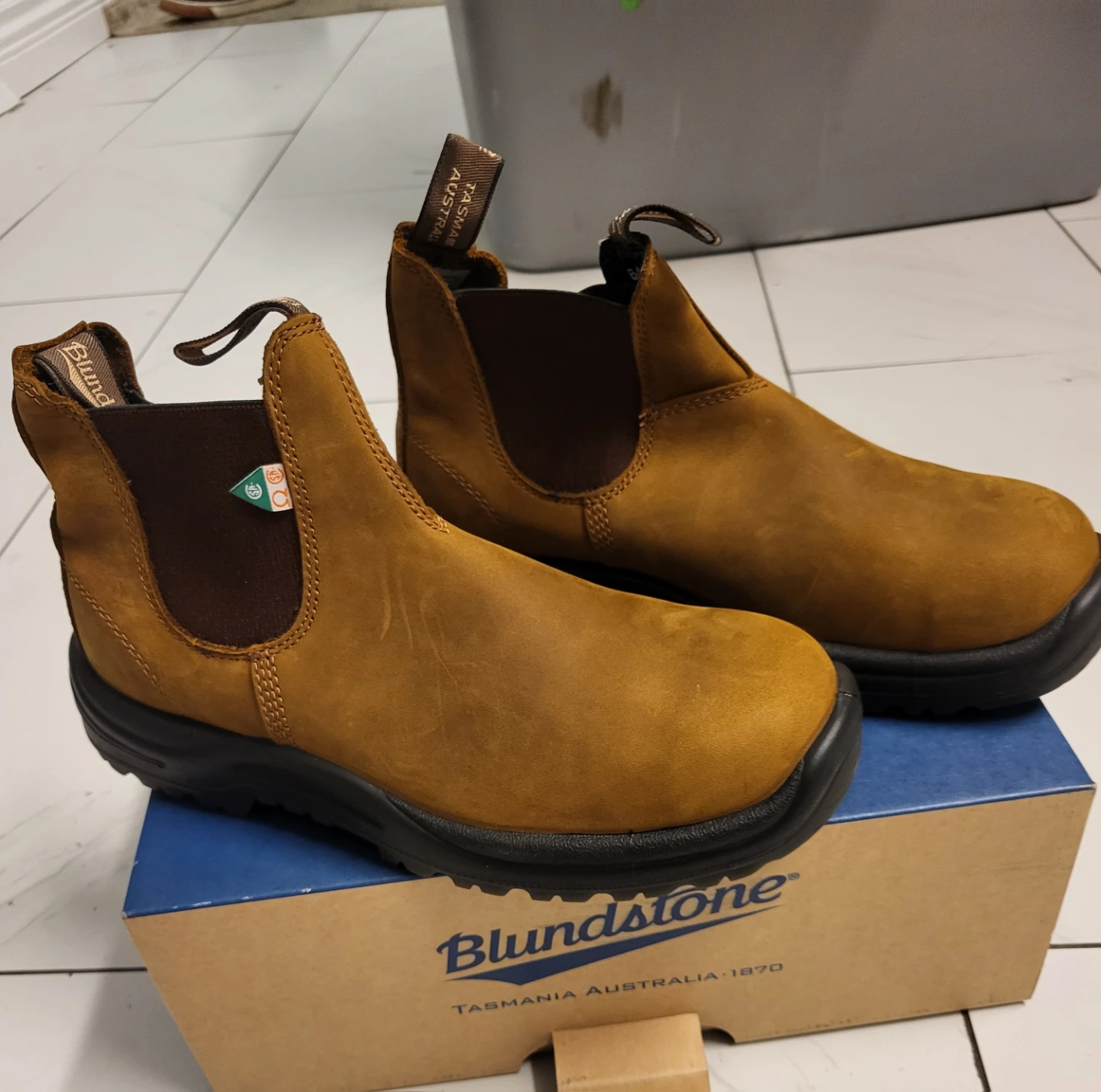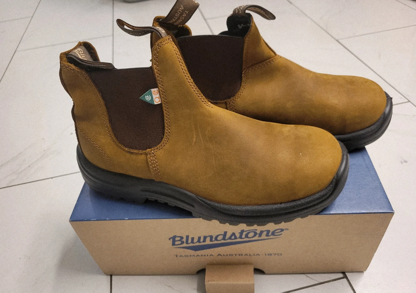 Selling a pair of Blundstone 140 safety boots in brown leather, size 9! These are in great condition and come with the original box and insoles. Perfect for work or everyday wear!