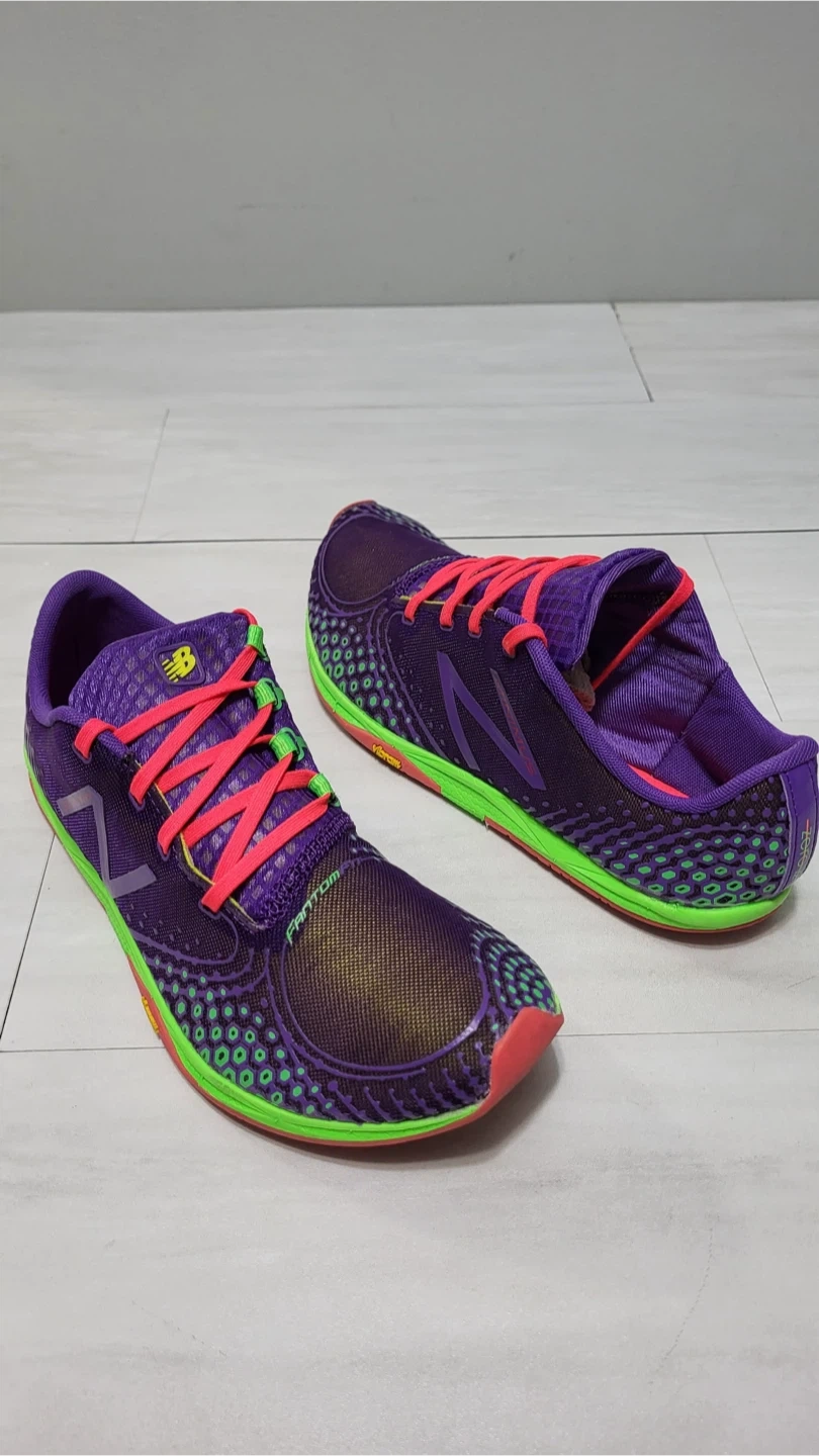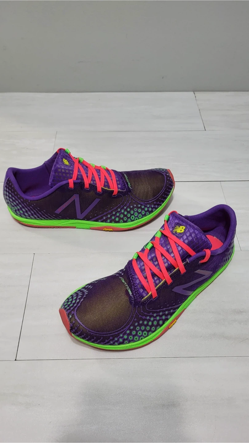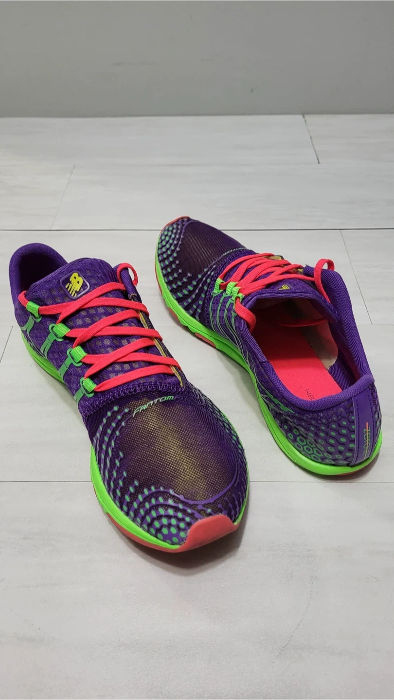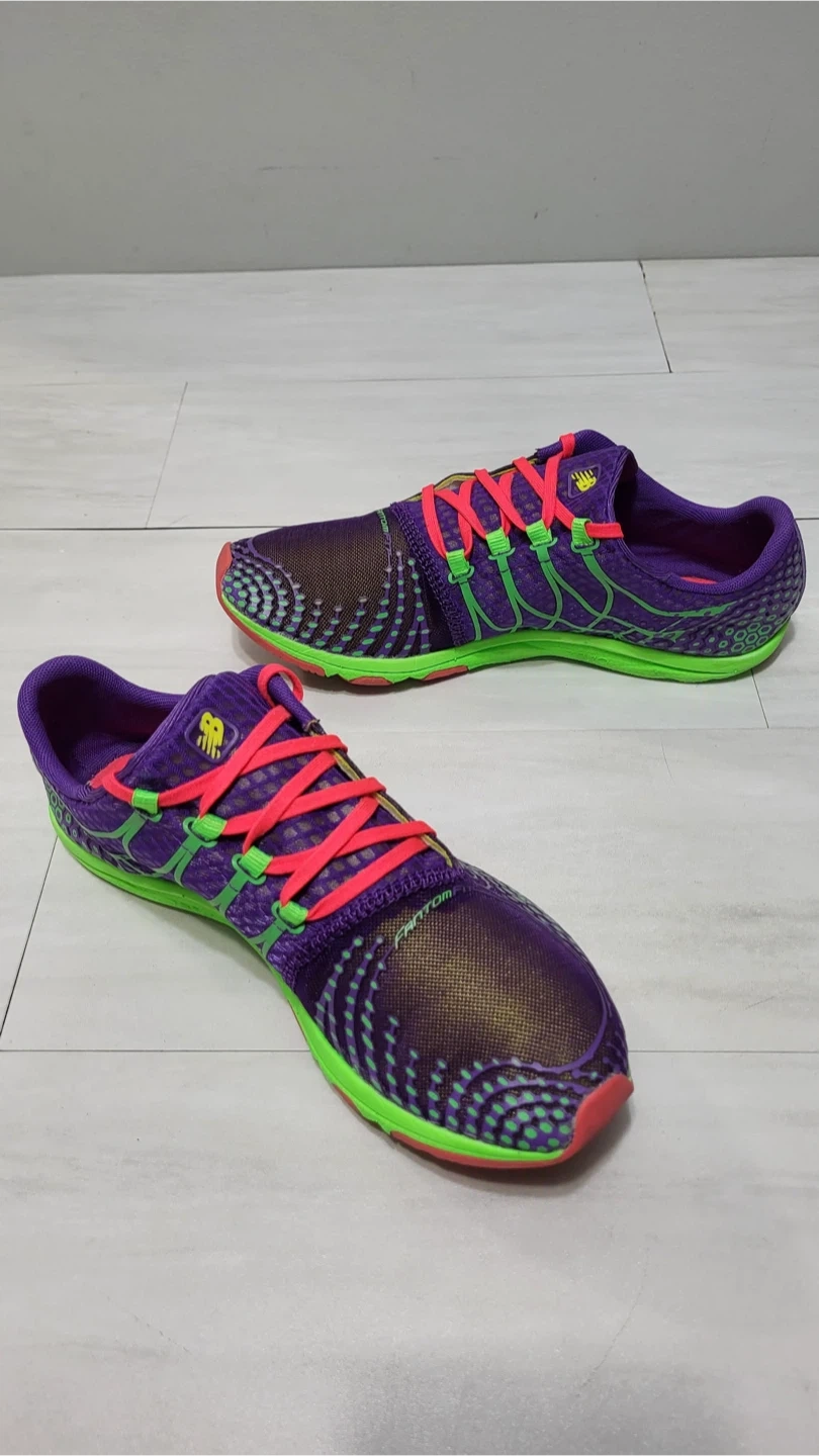 Selling a pair of good used condition New Balance Minimus running shoes in a vibrant purple and green colourway! They feature a Vibram sole for great traction and a minimalist design for a natural feel. These shoes are perfect for runners looking for a lightweight and flexible option.