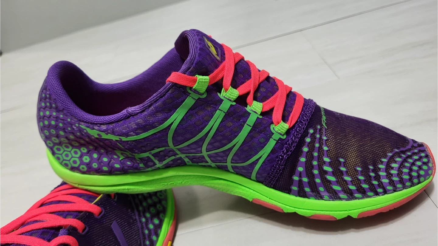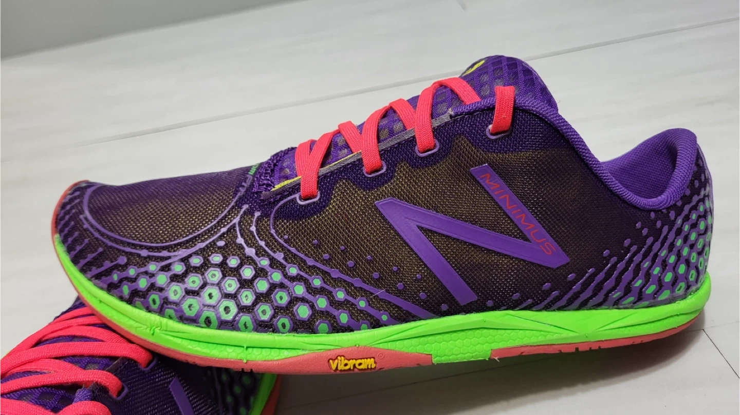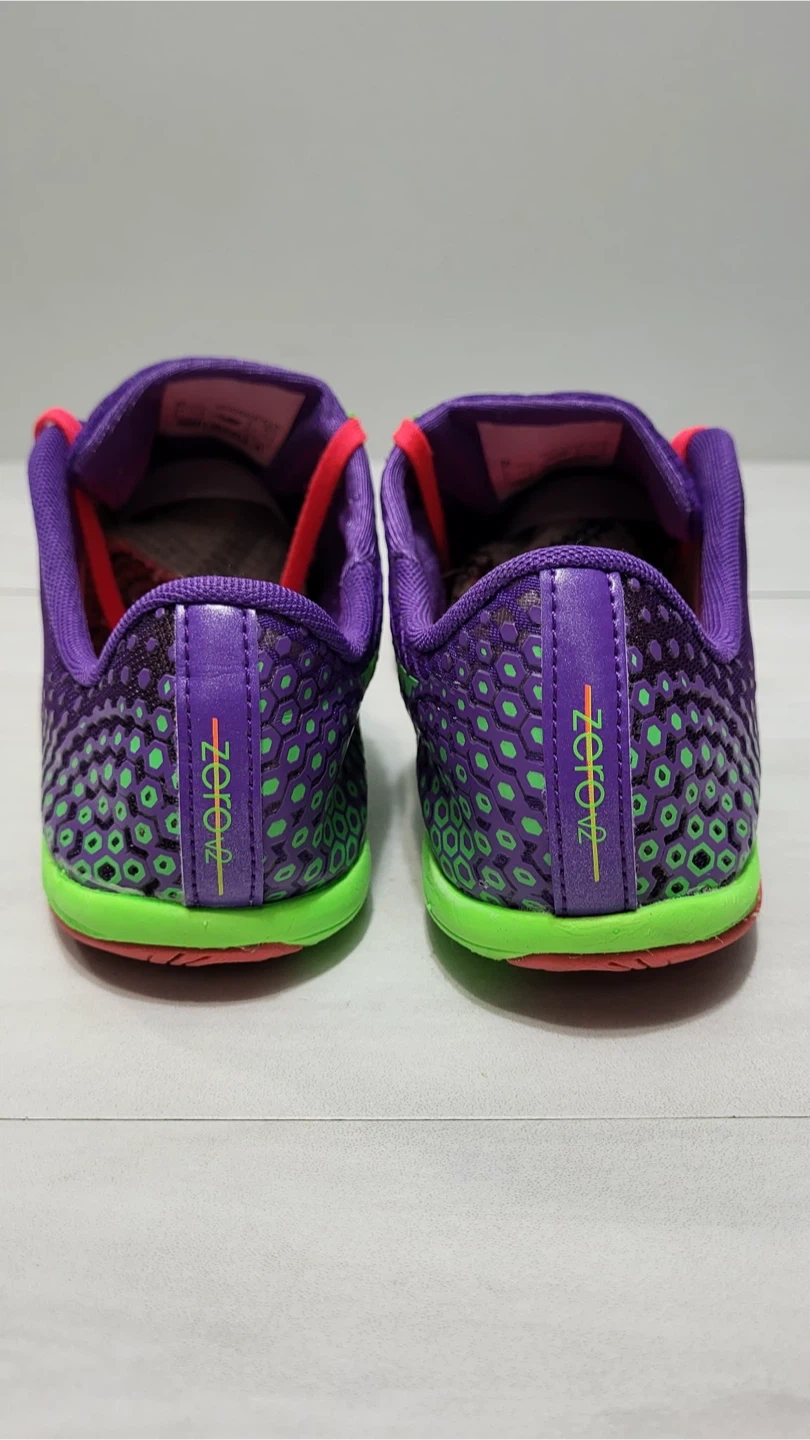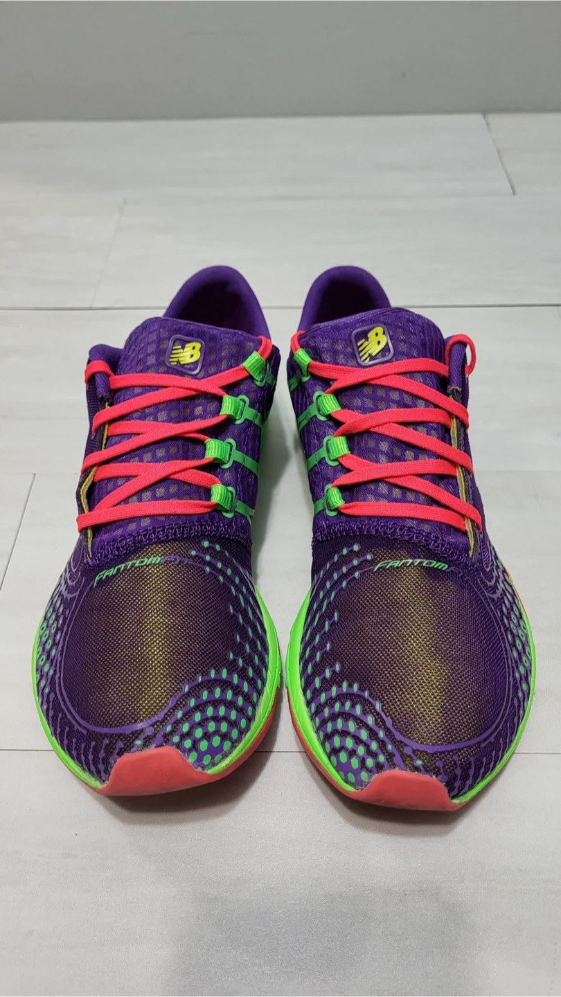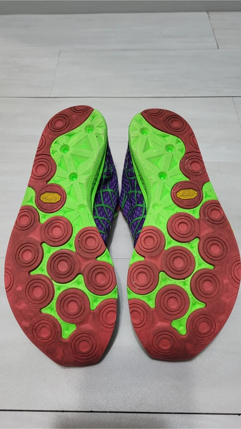 Selling a pair of good used condition New Balance Minimus running shoes in a vibrant purple and green colourway! They feature a Vibram sole for great traction and a minimalist design for a natural feel. These shoes are perfect for runners looking for a lightweight and flexible option.