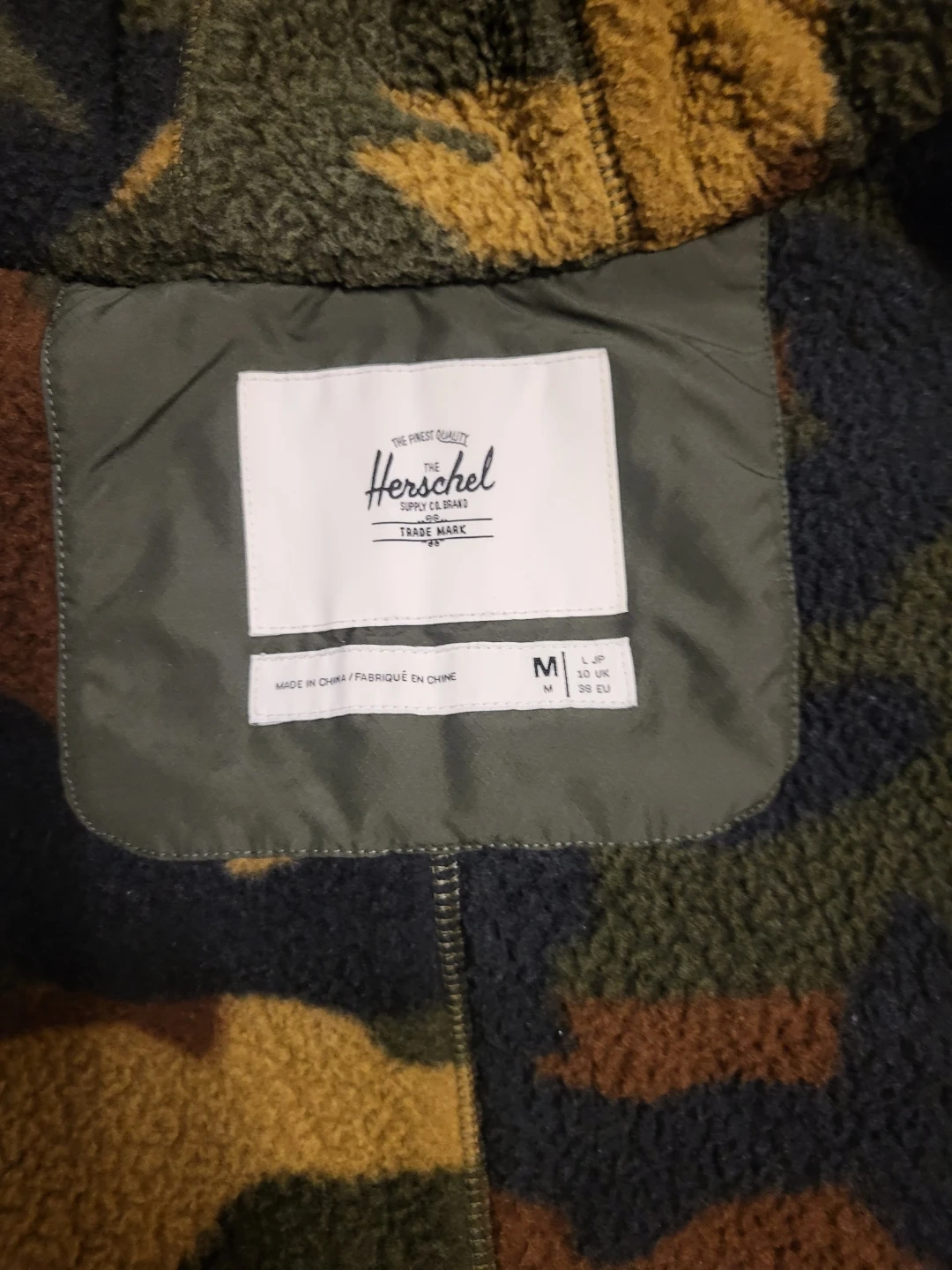 Selling a Herschel parka in olive green. It's a size M and in great condition! The inside is lined with a camouflage pattern fleece. Perfect for the cooler weather!