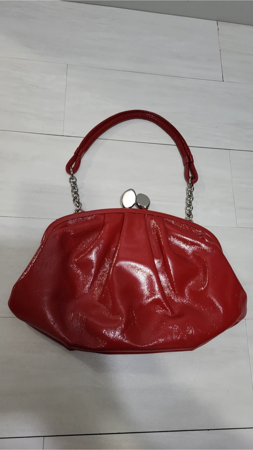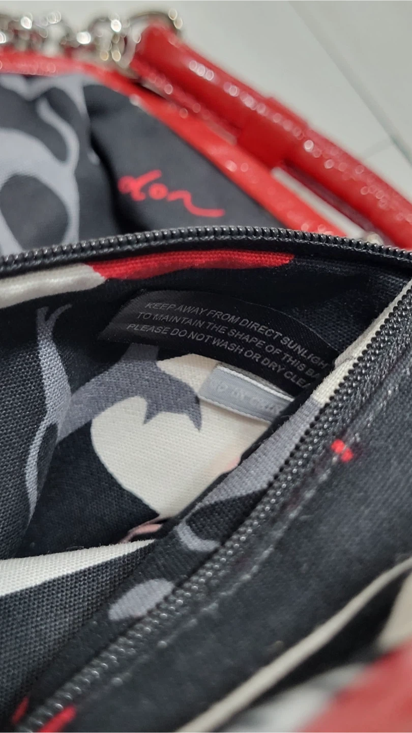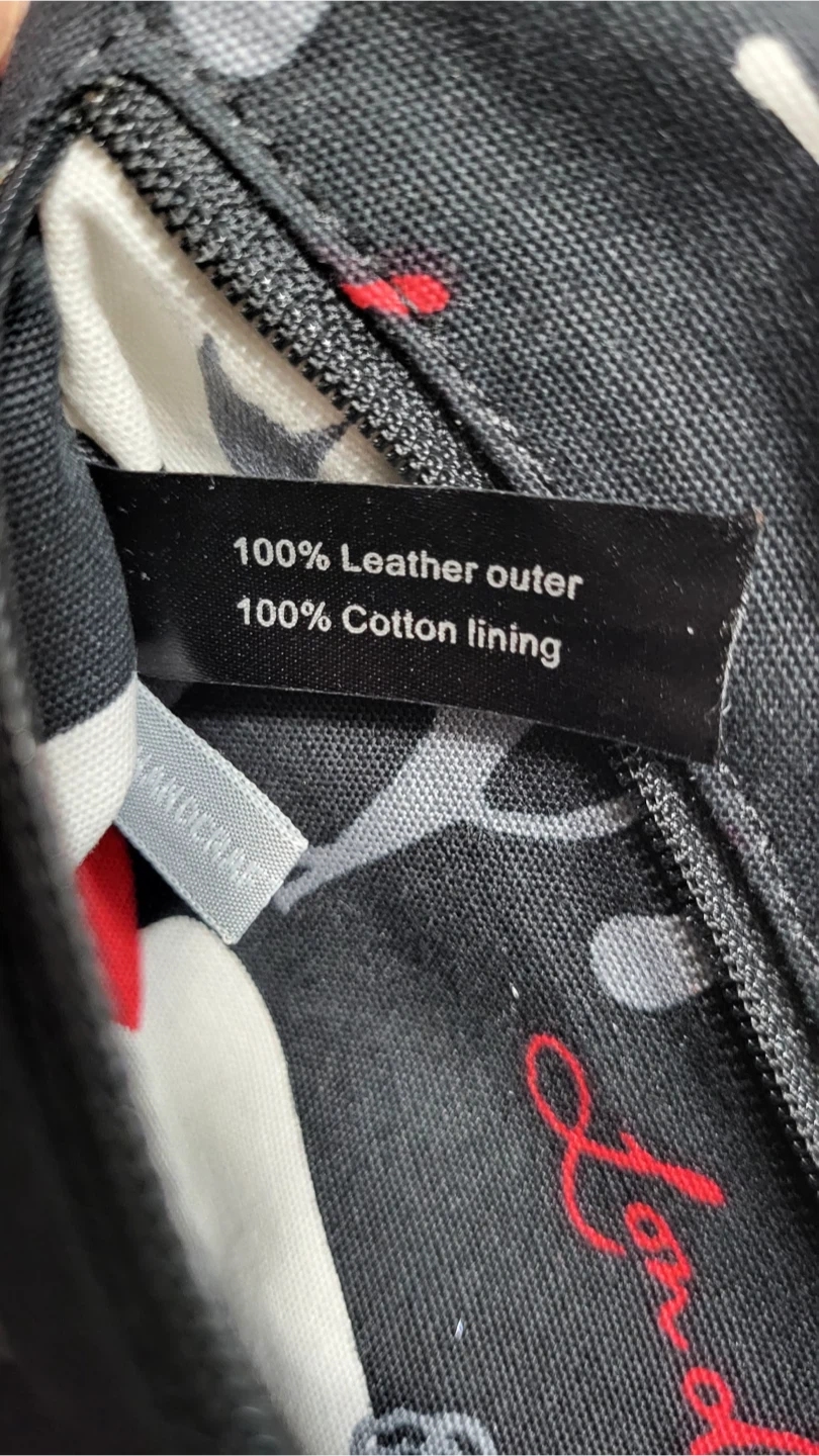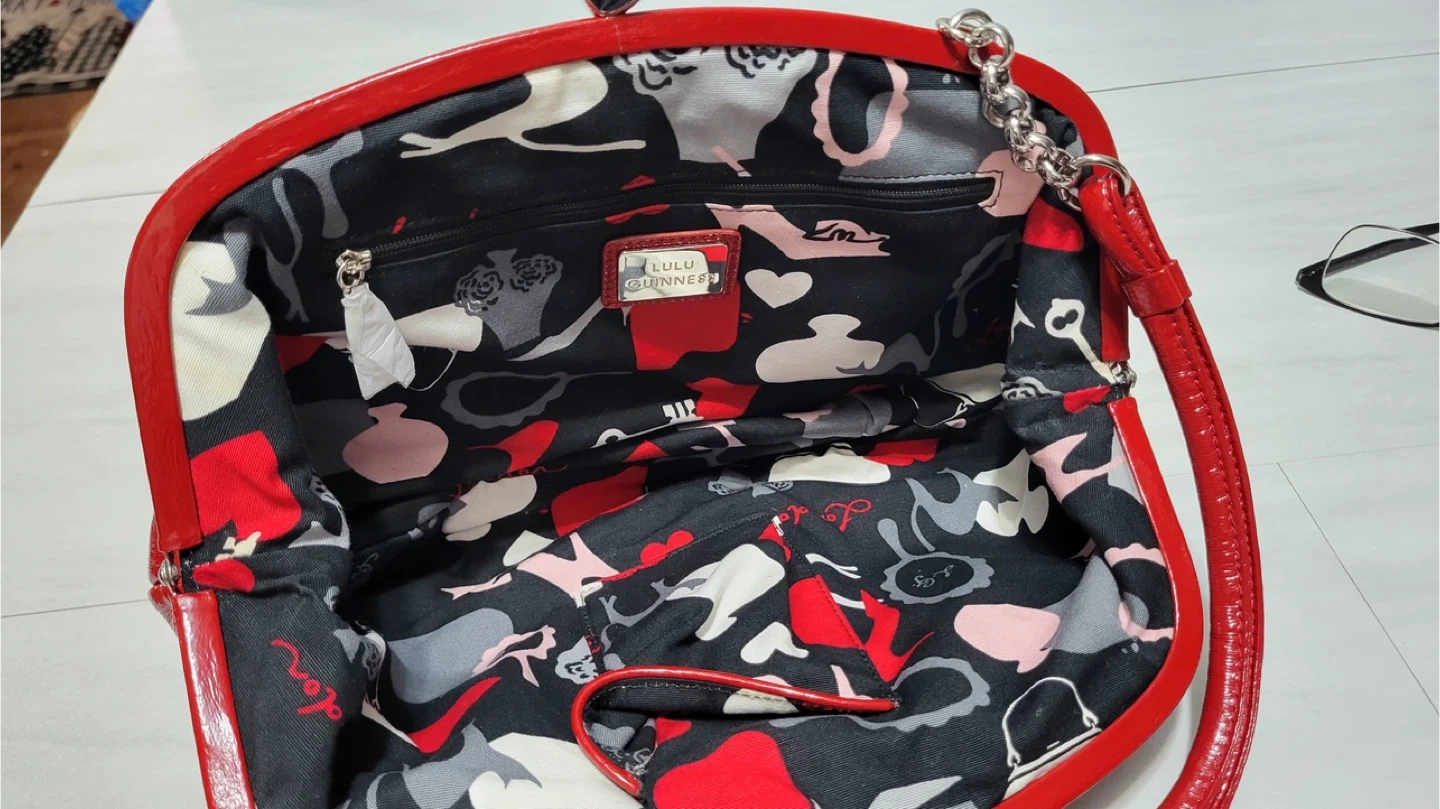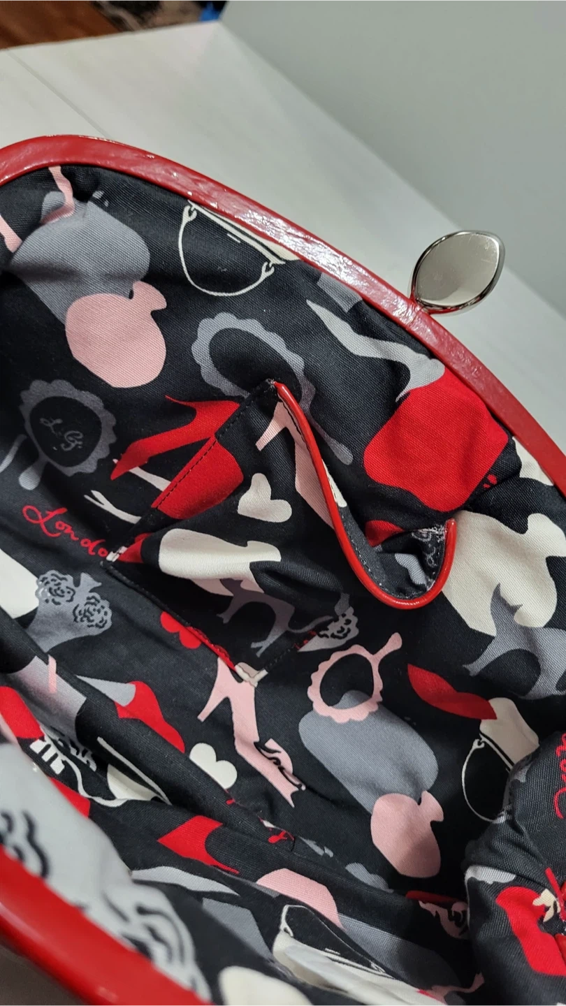 This is a Lulu Guinness clutch purse in a vibrant red colour. It features a 100% leather outer and a 100% cotton lining. The inside has a fun design with London themed accents. It's perfect for adding a pop of colour to your outfit! Excellent used condition.