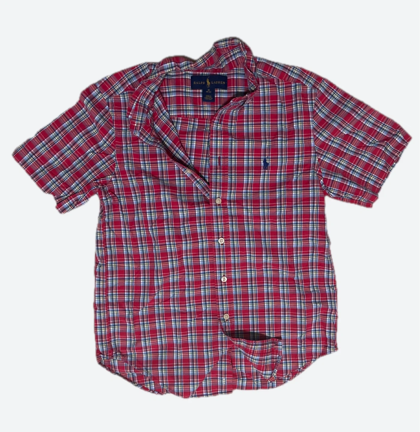 Here's a Ralph Lauren button-down shirt in a colourful plaid pattern! It's a size M (10-12). The shirt is made in Vietnam and has the classic Ralph Lauren logo on the chest