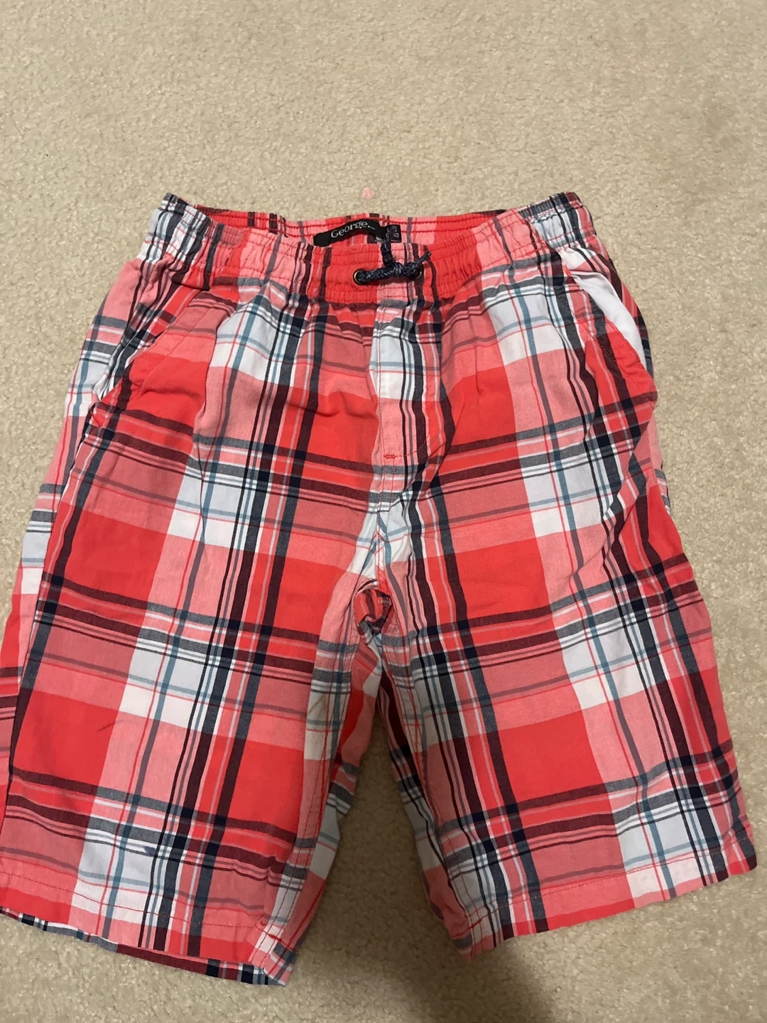 Two pairs of shorts for your little one! One pair is from Old Navy and is a light blue colour. The other pair is from George and is a red, white, and blue plaid pattern.