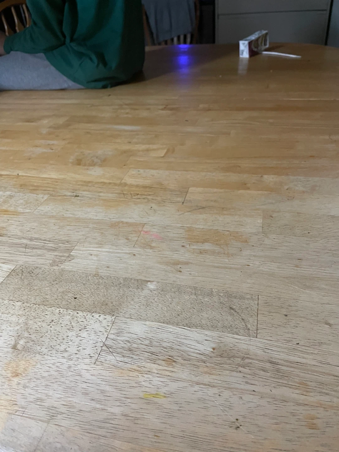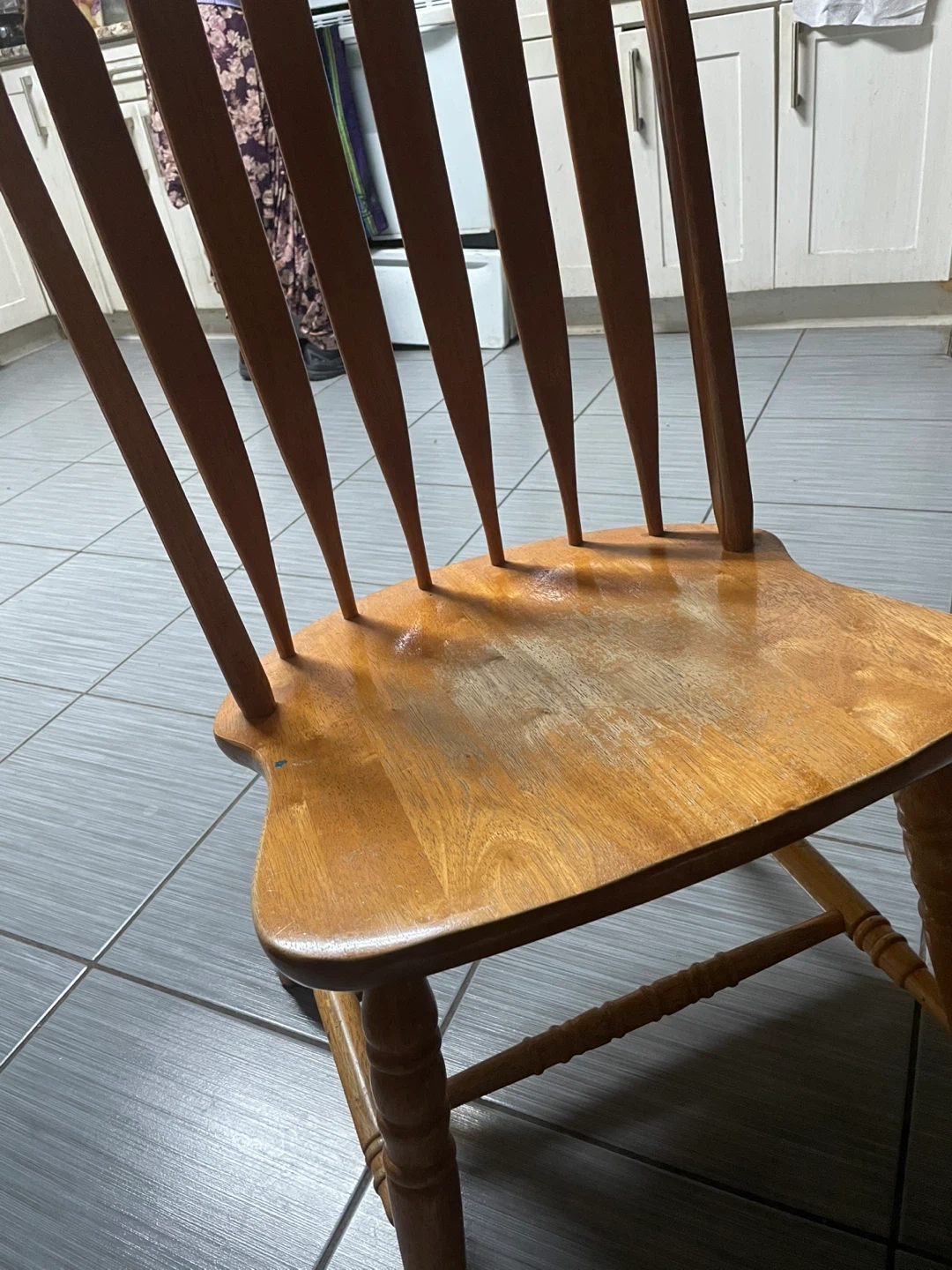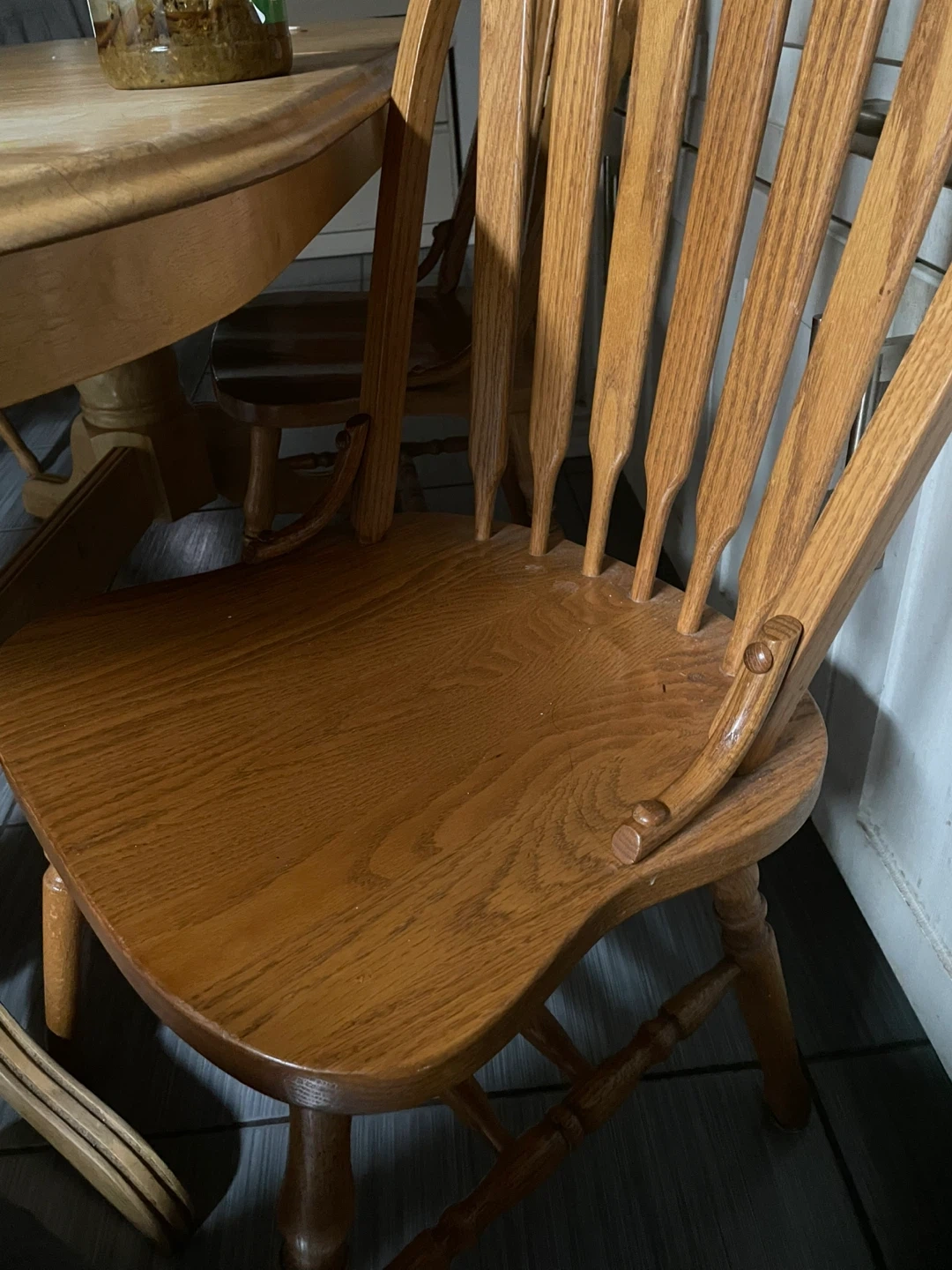 Selling a wooden dining table with matching chairs. The set shows some signs of use, but is still sturdy and functional. Perfect for a kitchen or dining room!