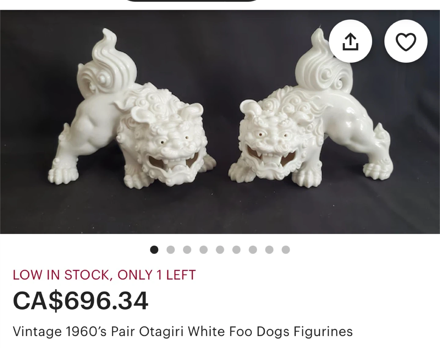 Buy & SellVintage Otagiri White Foo Dogs FigurinesVintage Otagiri White Foo Dogs Figurines$585Here's a pair of vintage Otagiri white foo dogs figurines. They're in great shape and ready to guard your home! I saw them online for $696.34.ConditionLike newWHERE TO MEETCheck LocationView MapSELLERverifiedSvitlanaQueensway23514 reviews0 chats·2 favorites·21 viewsSEND CHAT TO SELLERHi Svitlana! I’m interested in your listing.Hi Svitlana! I’m interested in your listing.Get the Karrot app to chatSign In to chat