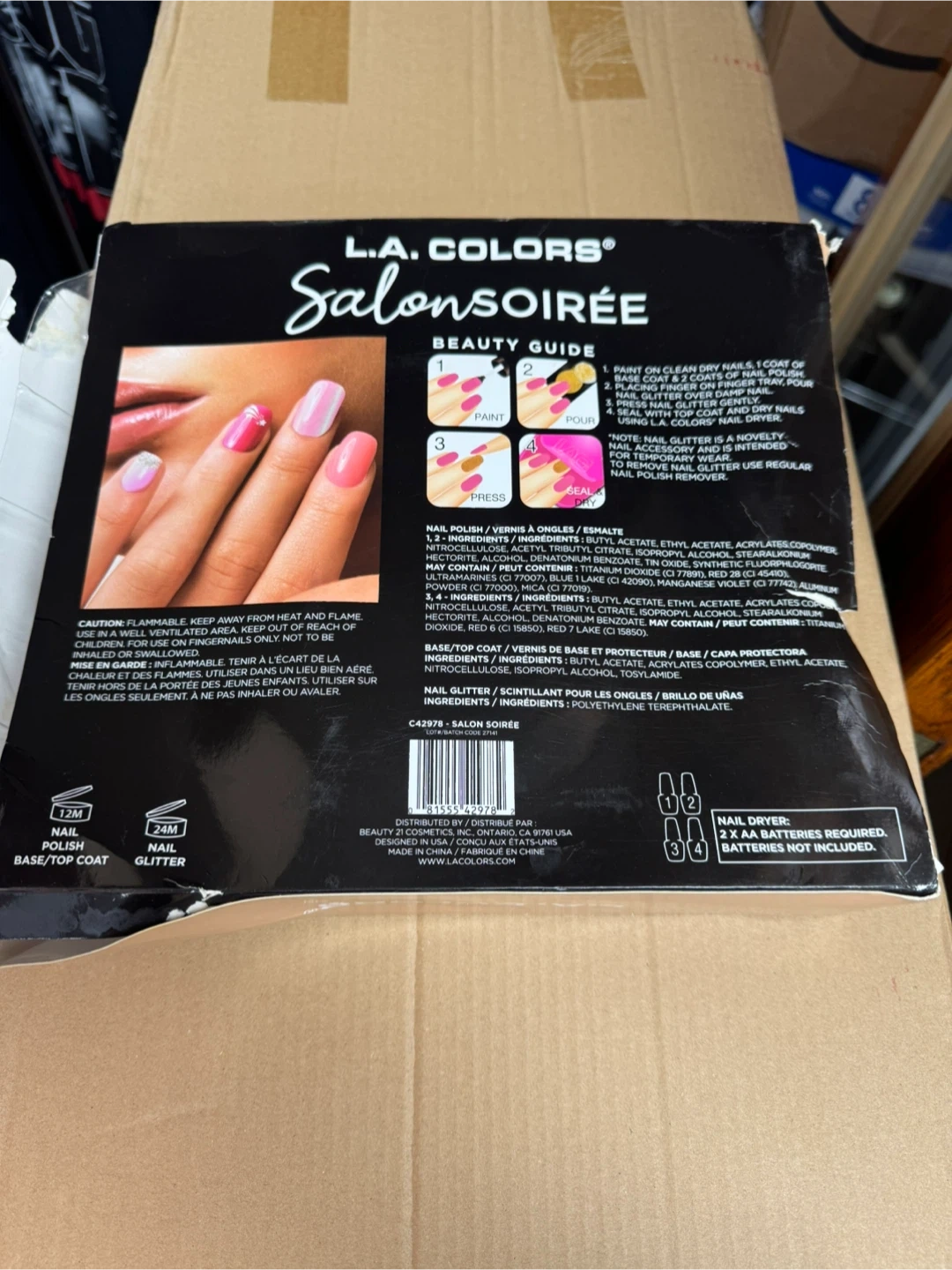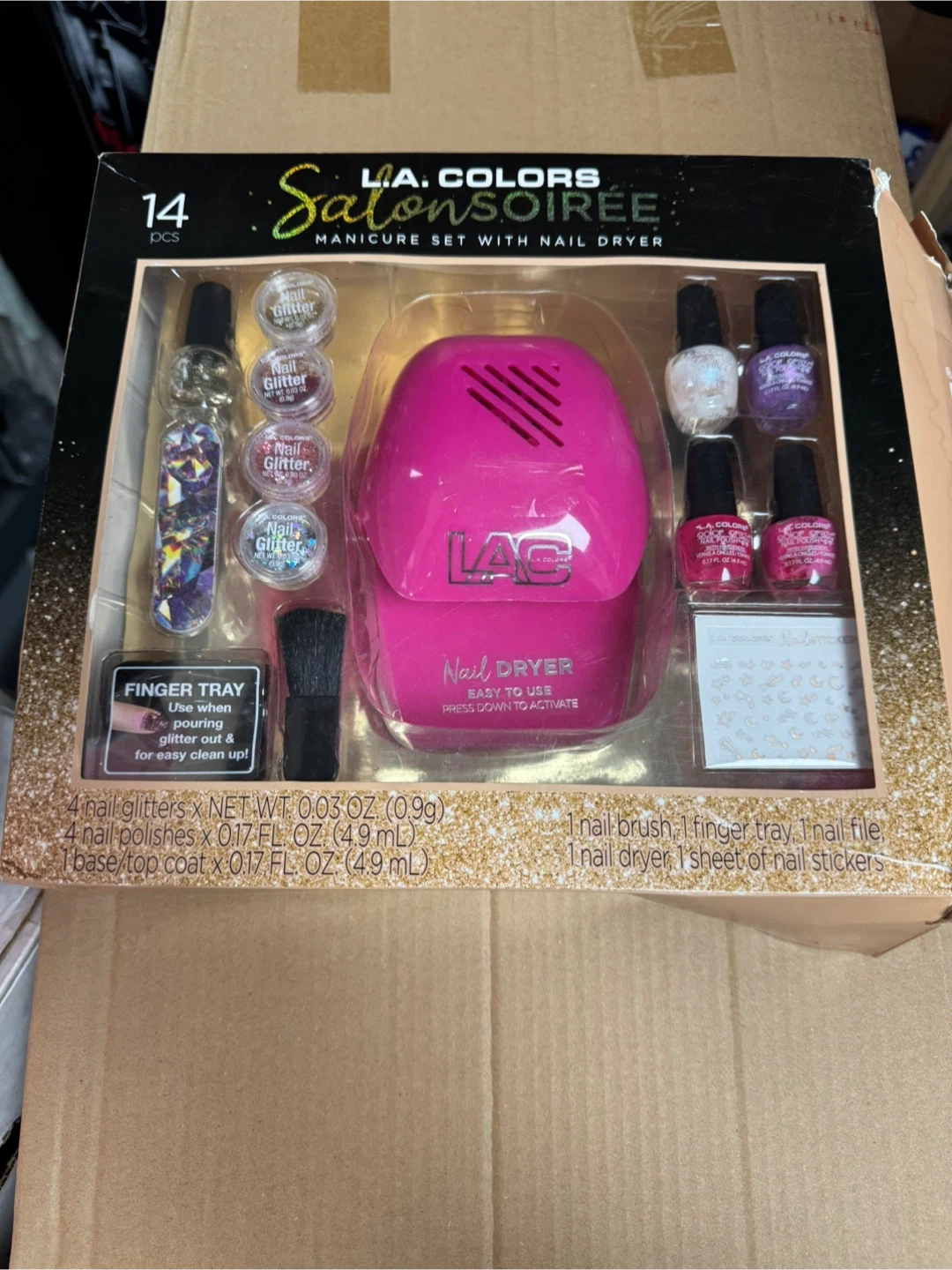 Selling a L.A. Colors Salon Soiree manicure set with a nail dryer. This set includes nail glitters, nail polishes, a nail brush, finger tray, nail file, and a sheet of nail stickers. The nail dryer is easy to use and press down to activate. Please note that 2x AA batteries are required for the nail dryer, but they are not included. Base/top coat and glitter are also included!
