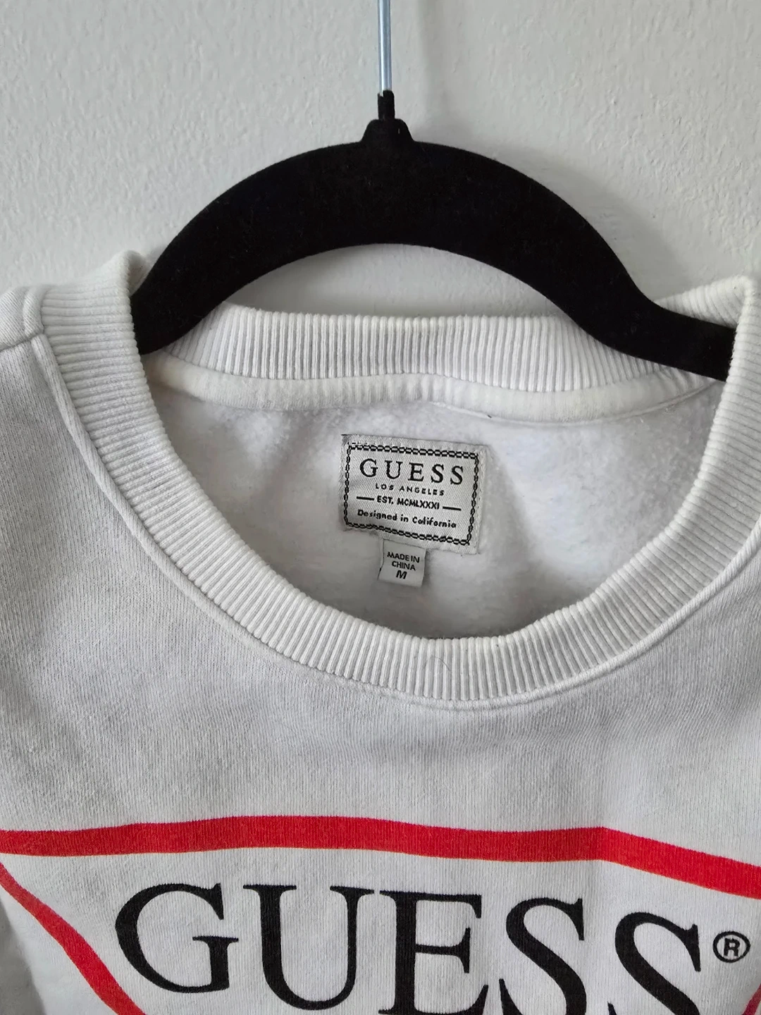 Selling a Guess U.S.A. sweatshirt in white. It's a size medium and in great condition. The classic Guess logo is featured prominently on the front. Perfect for casual wear!
