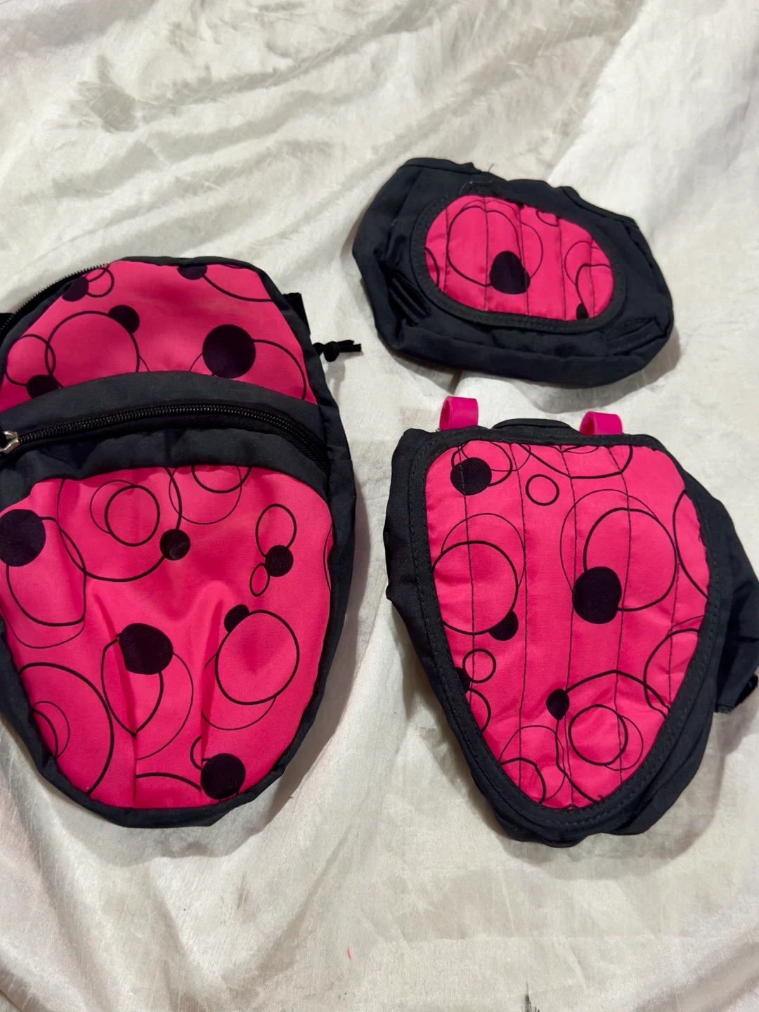 Selling a cute ladybug-themed backpack with matching accessories! It's in great condition and ready for a new adventure. The backpack is black and pink with black polka dots. Perfect for little ones!