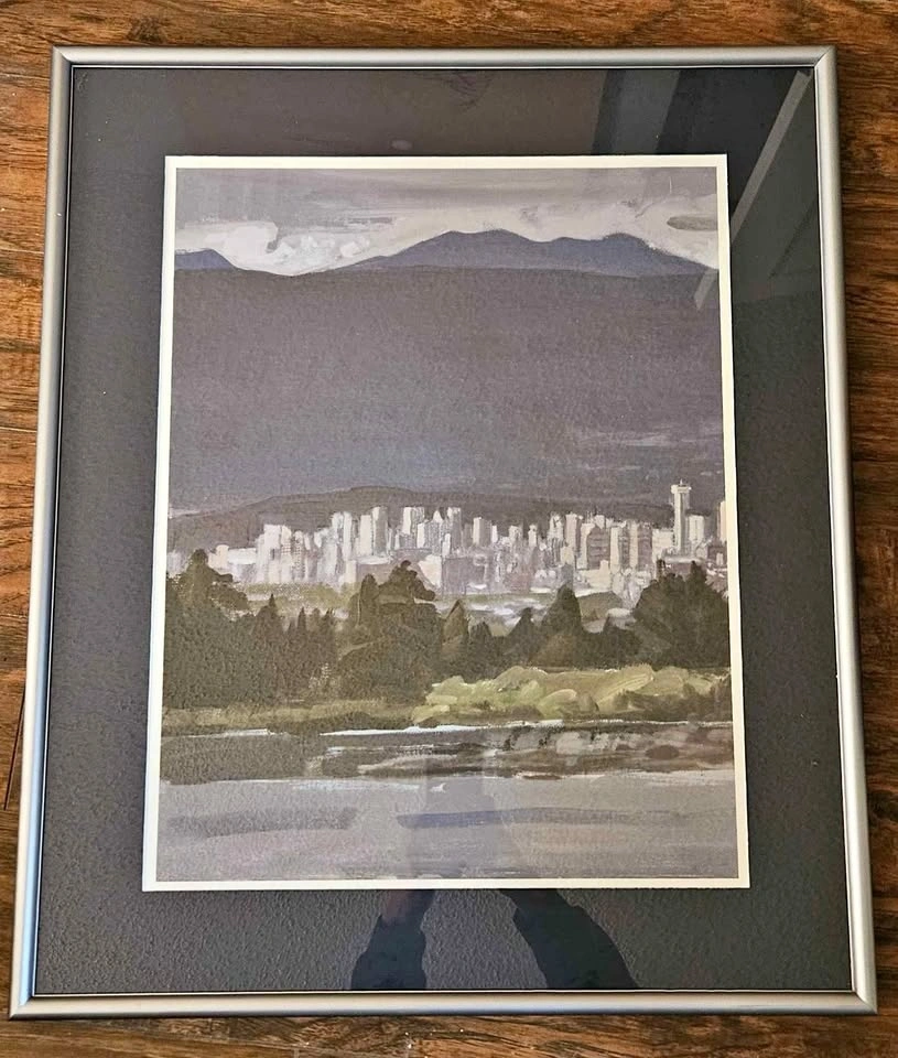 Beautiful framed cityscape painting with mountains in the background. Silver frame with black matting and white border. Good condition. Approx 13"×26" pick up near Guildford Mall.