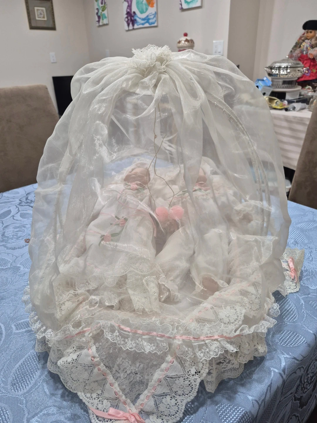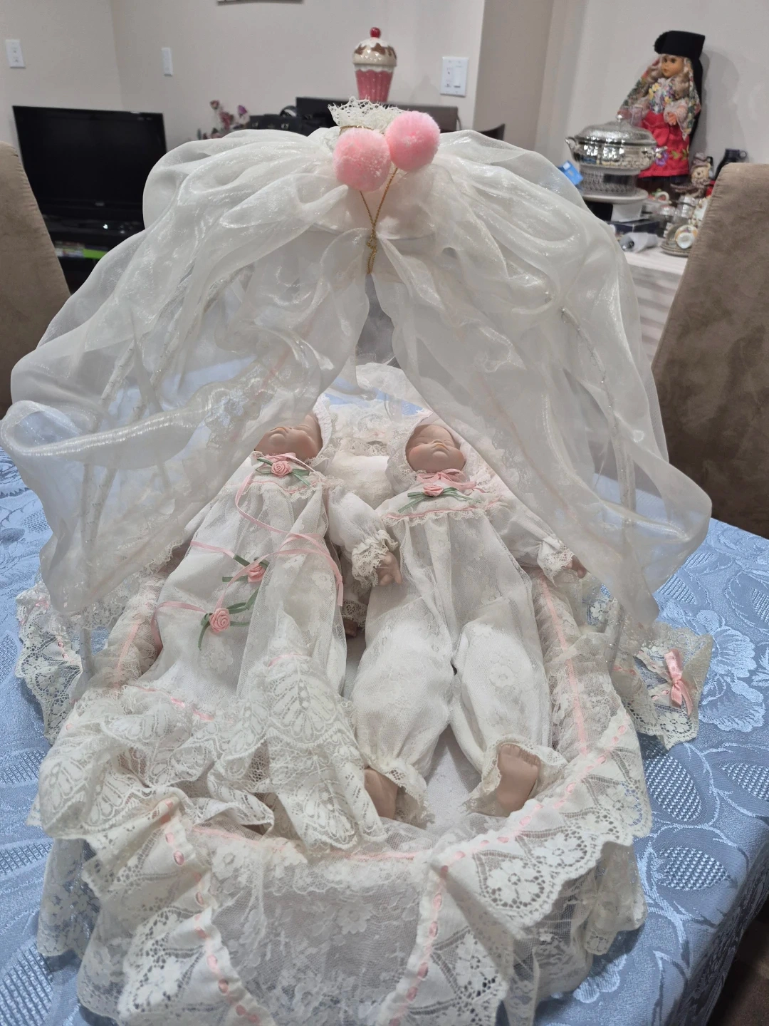 These adorable twin dolls are nestled in a lovely bassinet with a delicate canopy. They're dressed in white lace outfits with pink ribbon accents. Perfect for a collector or as a charming addition to a nursery!