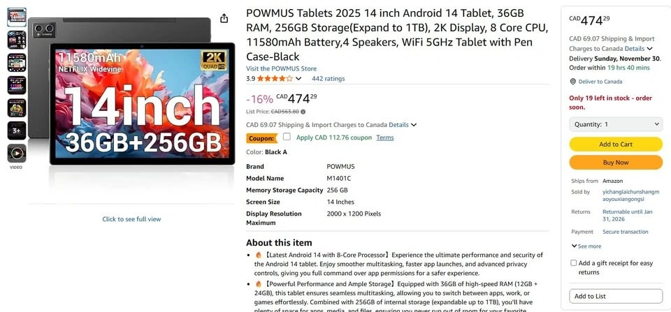 POWMUS 14 inch Android 14 Tablet 36GB RAM 256GB