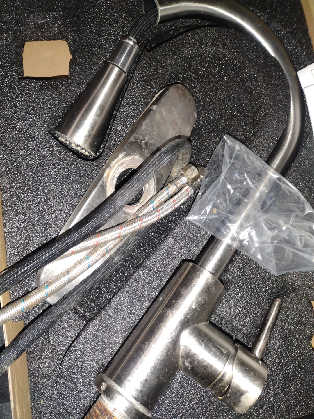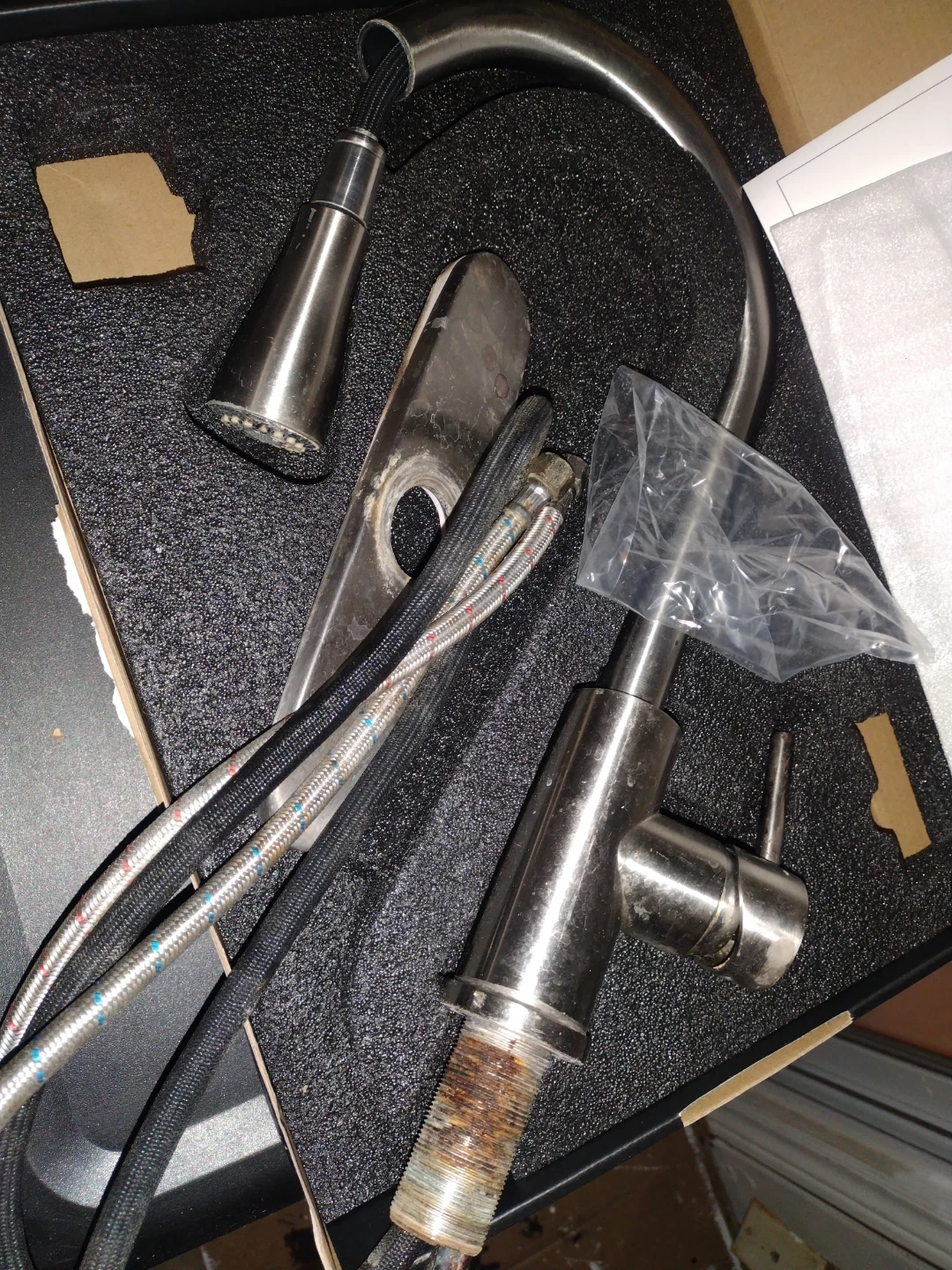 Selling a kitchen faucet that appears to be in good condition. It comes with the necessary components for installation, including the sprayer head, mounting plate, and hoses. It's a stylish stainless steel finish that would look great in any kitchen!