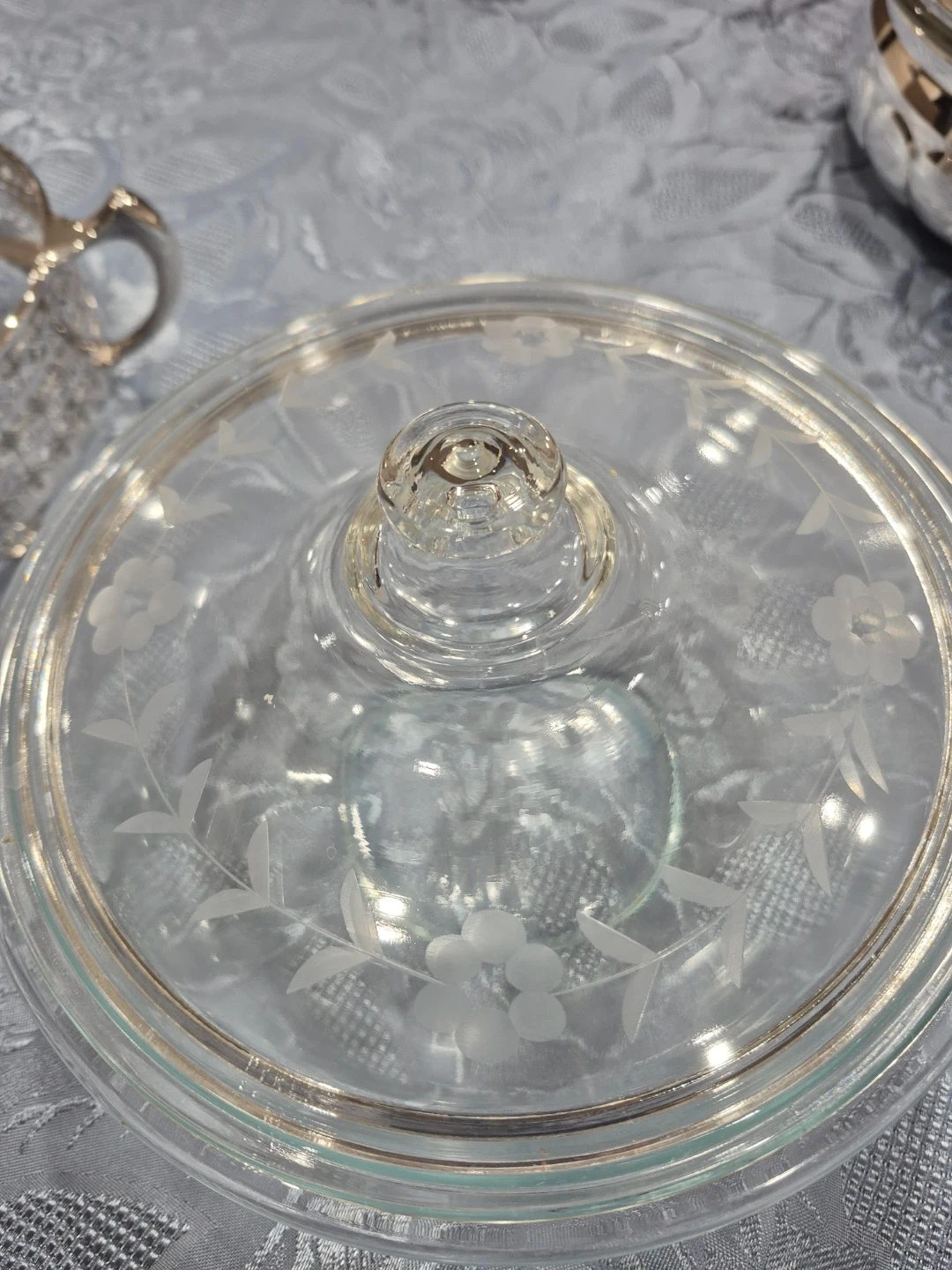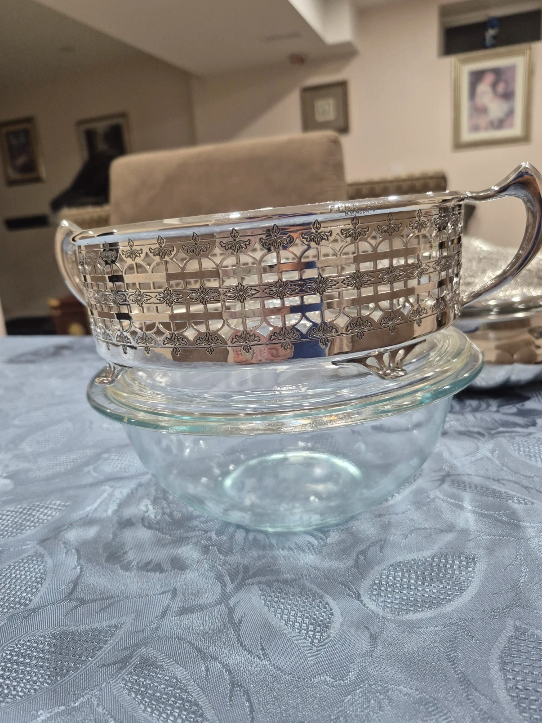 Selling a lovely vintage serving dish with a silver-plated frame and a clear glass bowl and lid. It's in great condition and would add a touch of elegance to any table setting!